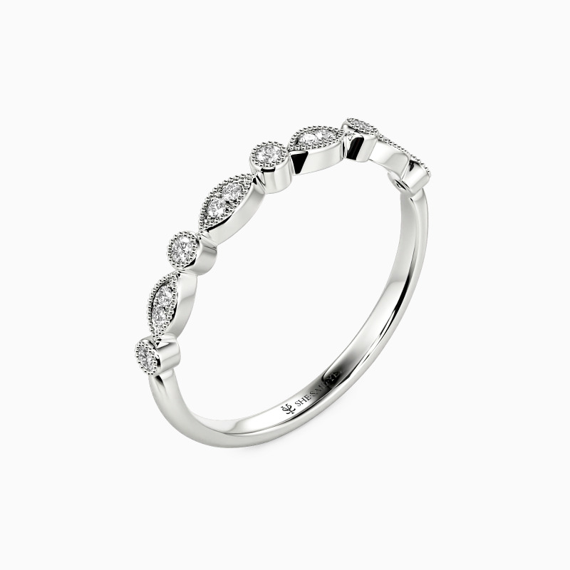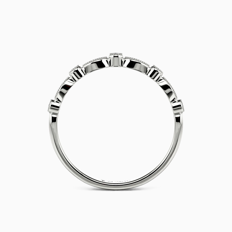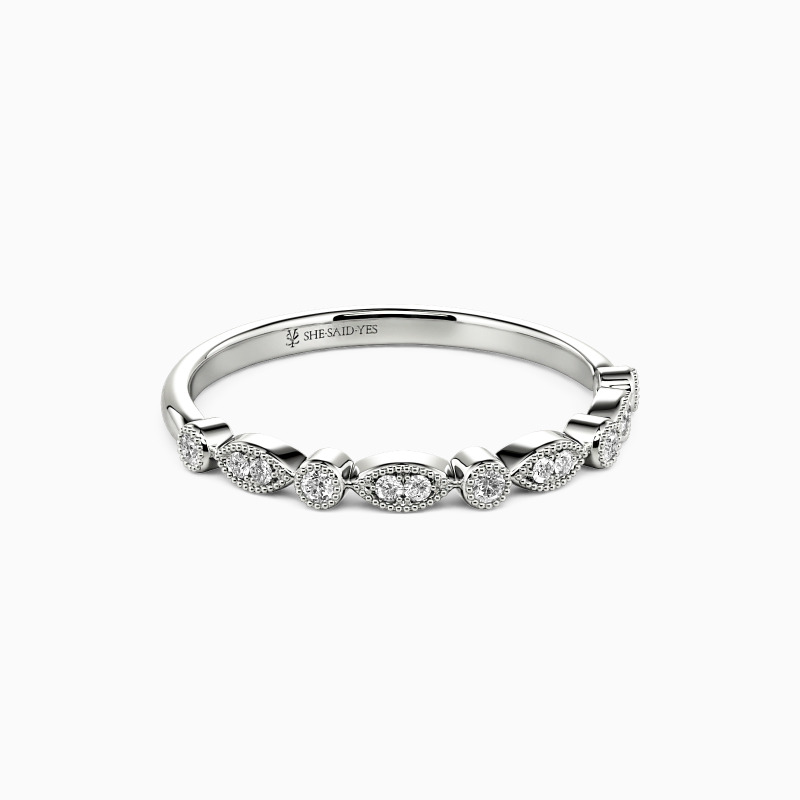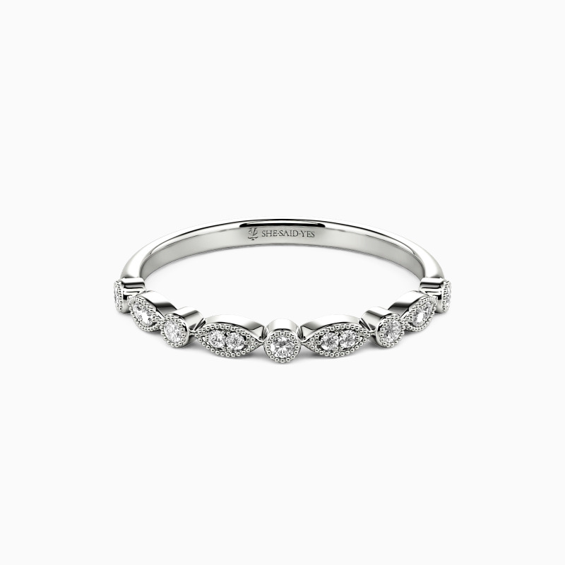 Small glittering round cut stones arranged in a marvelous prong and bezel setting cover half the delicate shank. And the milgrain embellishment adds extra charm and beauty. You can wear this wedding band alone or stack it with a halo engagement to memorize your forever love.