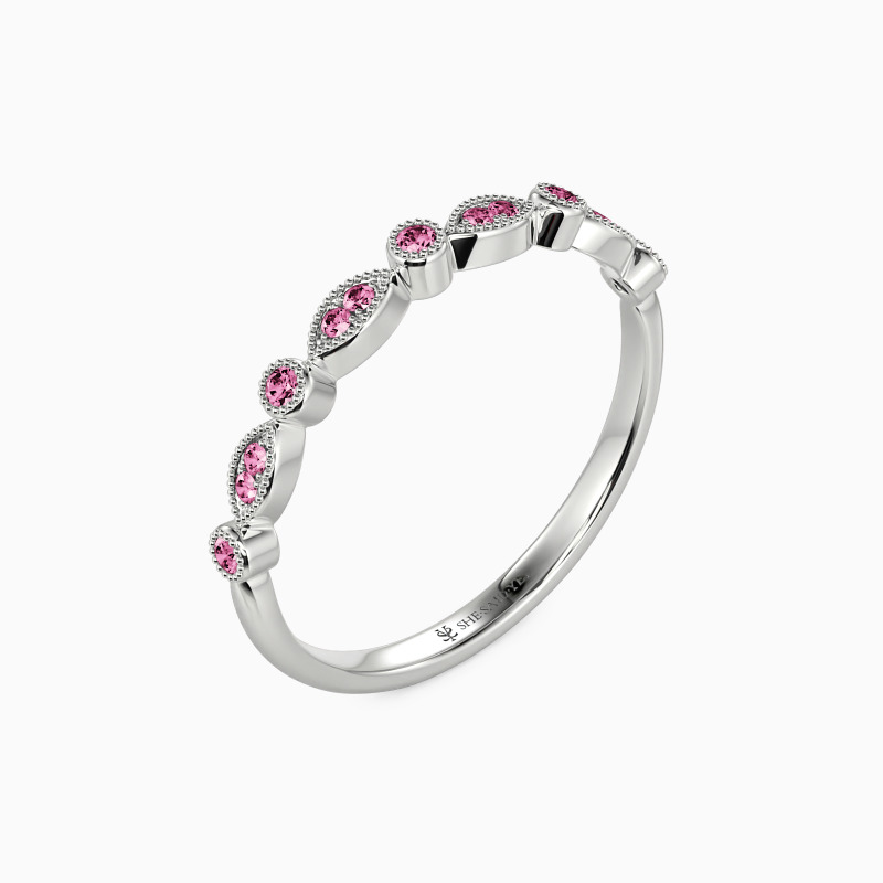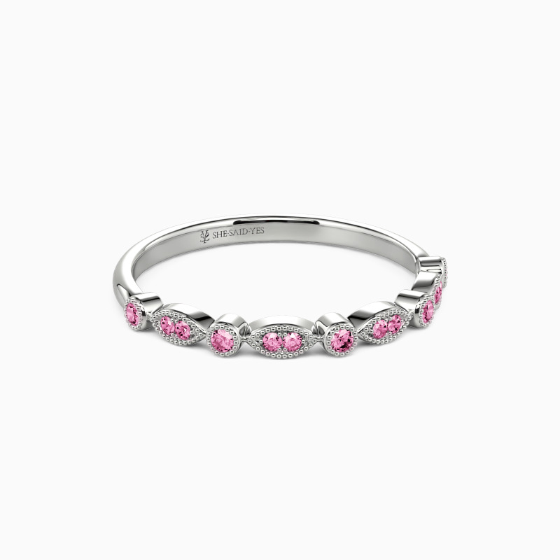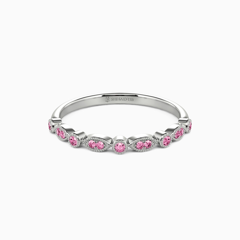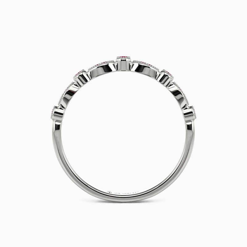 Small glittering round cut stones arranged in a marvelous prong and bezel setting cover half the delicate shank. And the milgrain embellishment adds extra charm and beauty. You can wear this wedding band alone or stack it with a halo engagement to memorize your forever love.