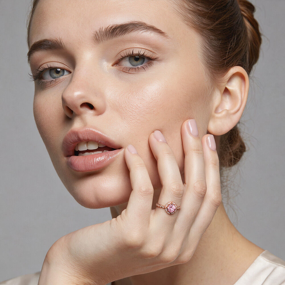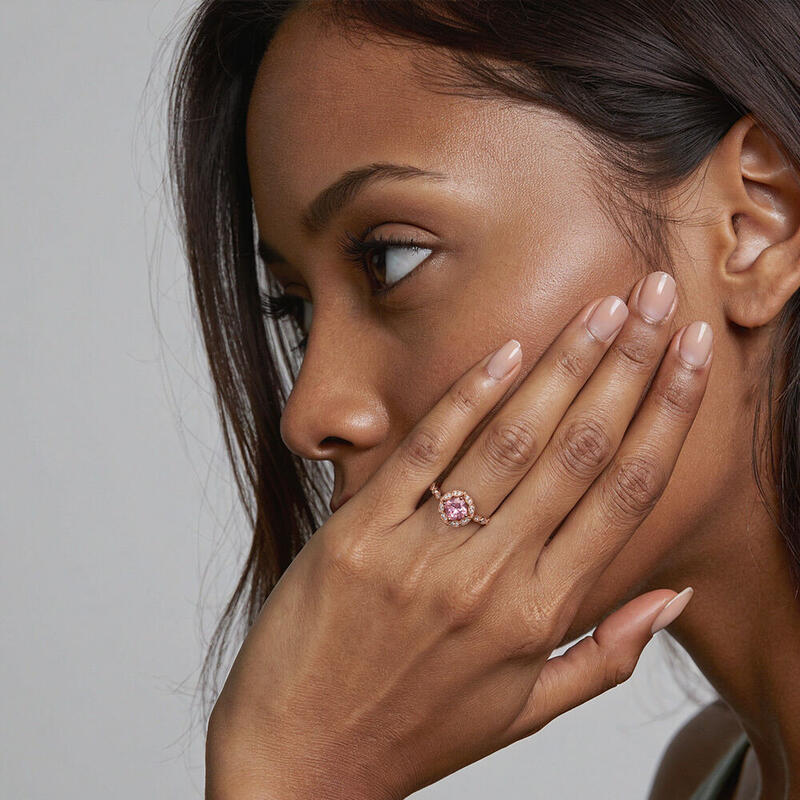 Vintage-inspired, suitable for the modern and stylish bride-to-be. This antique halo engagement ring will drive you back to retro fashion with the cushion cut center stone in prongs and set in a glimmering halo. And the whole ring shows a floral vintage aesthetic by the milgrain frame. Promise to stand by her side forever with this ring, and she'll give her all to you.