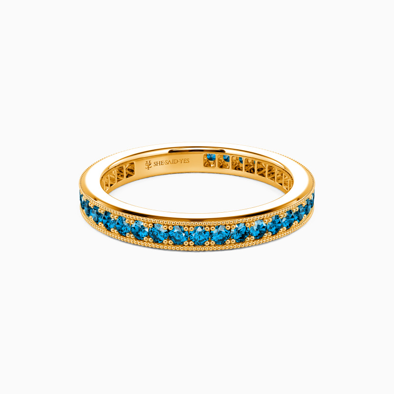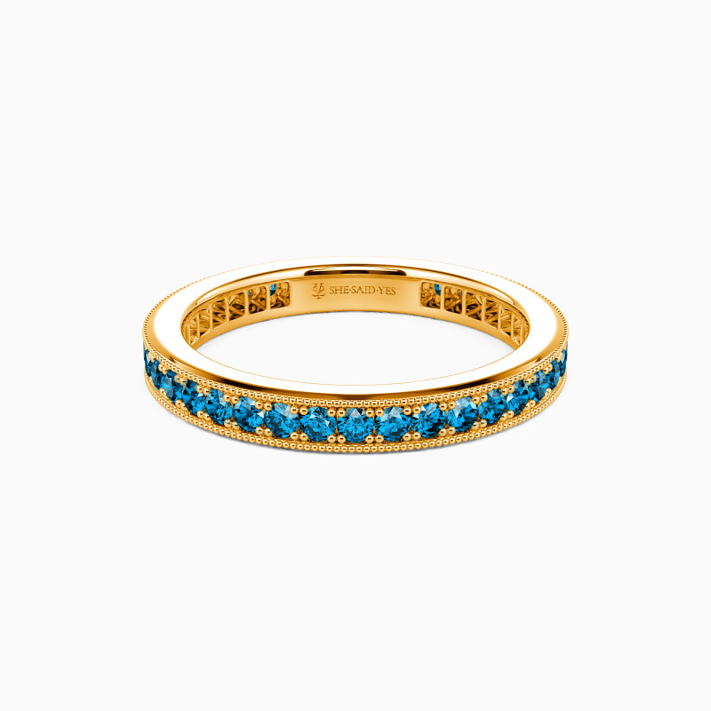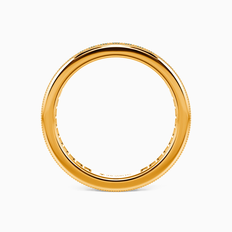 An array of pavéd accents is aligned to adorn the band, forming a continuous circle of brilliance. Half-hollow inner edges complete an unparalleled look for the whole ring. Two rows of milgrain patterns add to your fashionable glamour. Commemorate your forever love with this eternity wedding band.