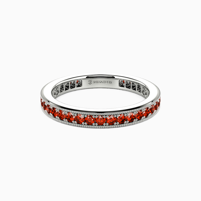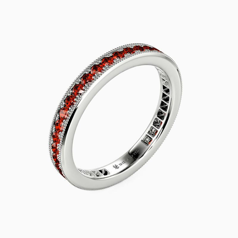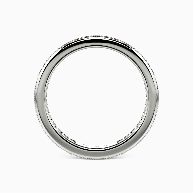 An array of pavéd accents is aligned to adorn the band, forming a continuous circle of brilliance. Half-hollow inner edges complete an unparalleled look for the whole ring. Two rows of milgrain patterns add to your fashionable glamour. Commemorate your forever love with this eternity wedding band.