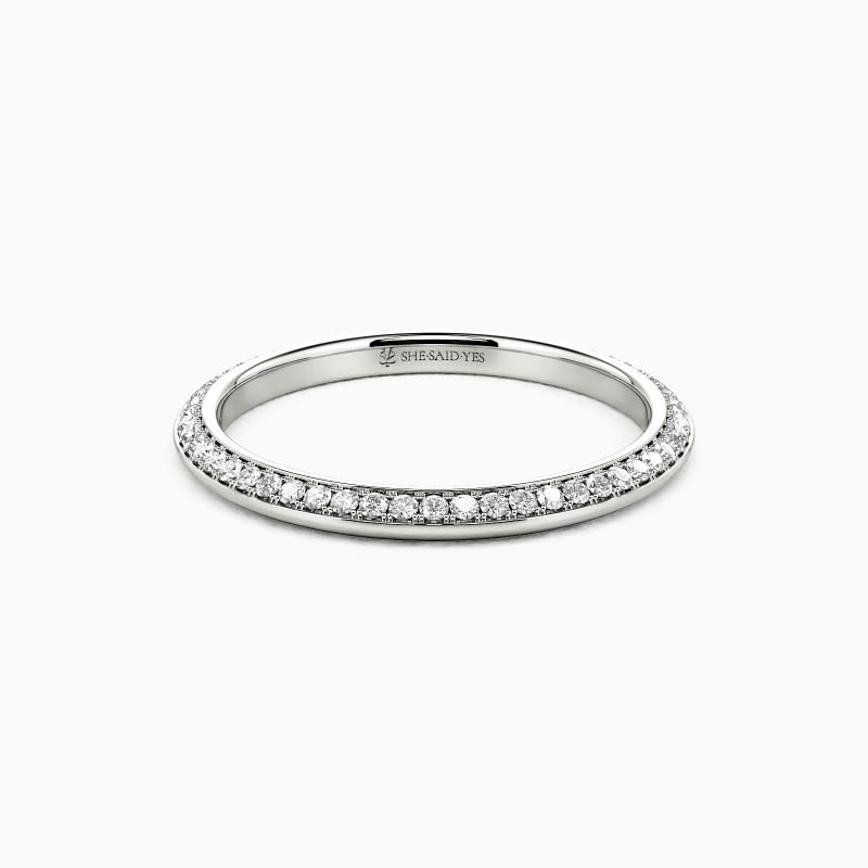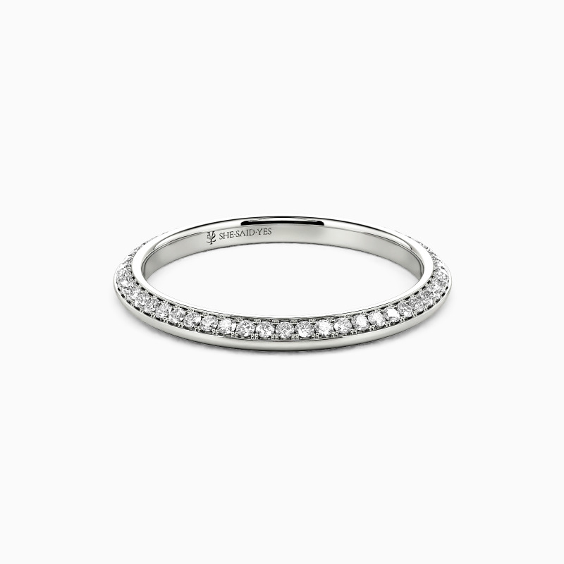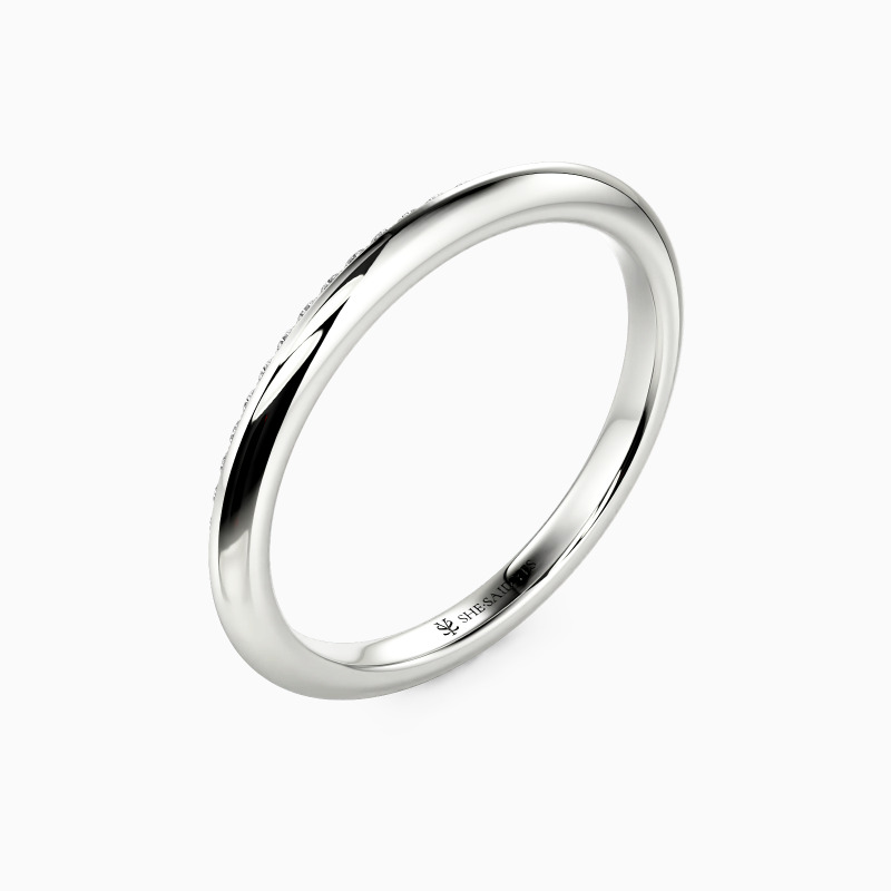 Simple and unique, a row of shiny round stones adorn the band's side. This simple design is created to maximize the light that hits the luminous gemstones from the front sides, enhancing their sparkle. You can pair it with an engagement ring to get the most glamour.