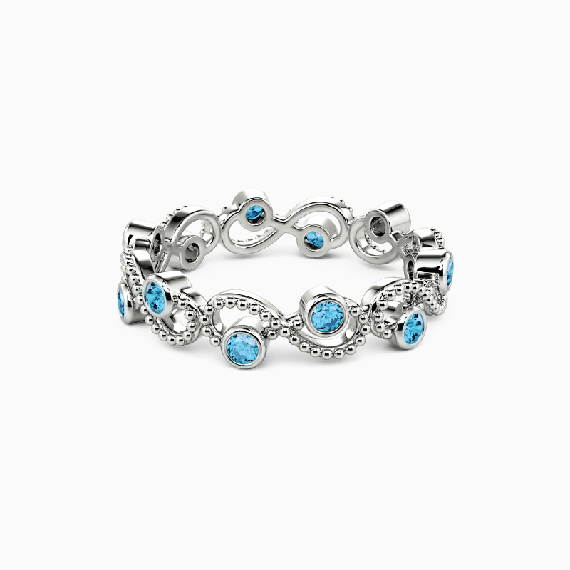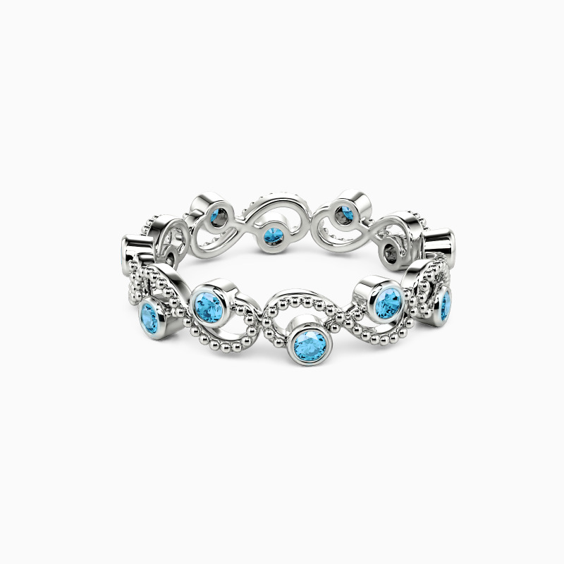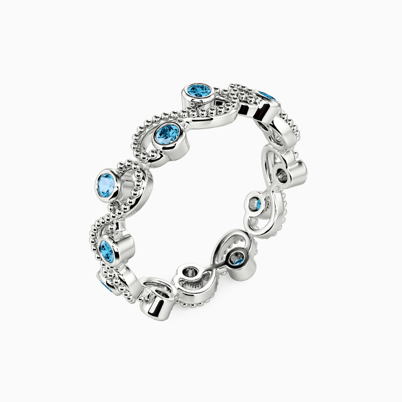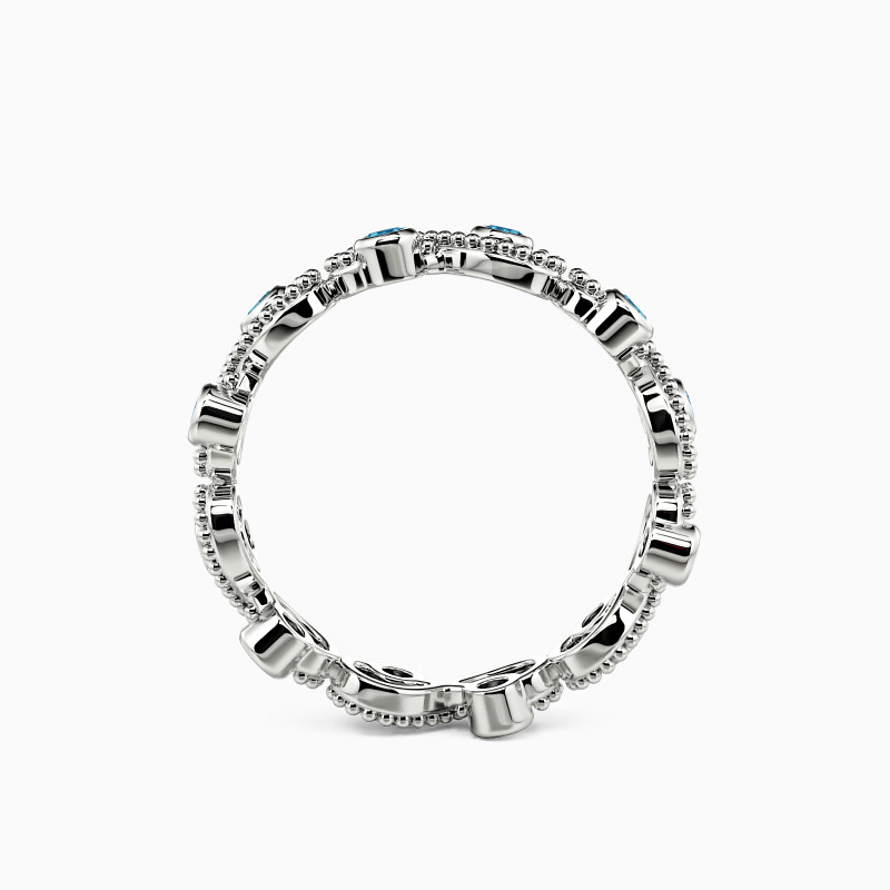 Take this chic eternity wedding band to make your fashion statement on the big day. Twisted design finishes this unparalleled style with shimmering round-cut stones in a bezel setting to bring you flawless brilliance. And the milgrain embellishments unveil vintage sense to match your attire. It is your ideal choice for stacking it with your engagement ring to complete an iconic bridal set.