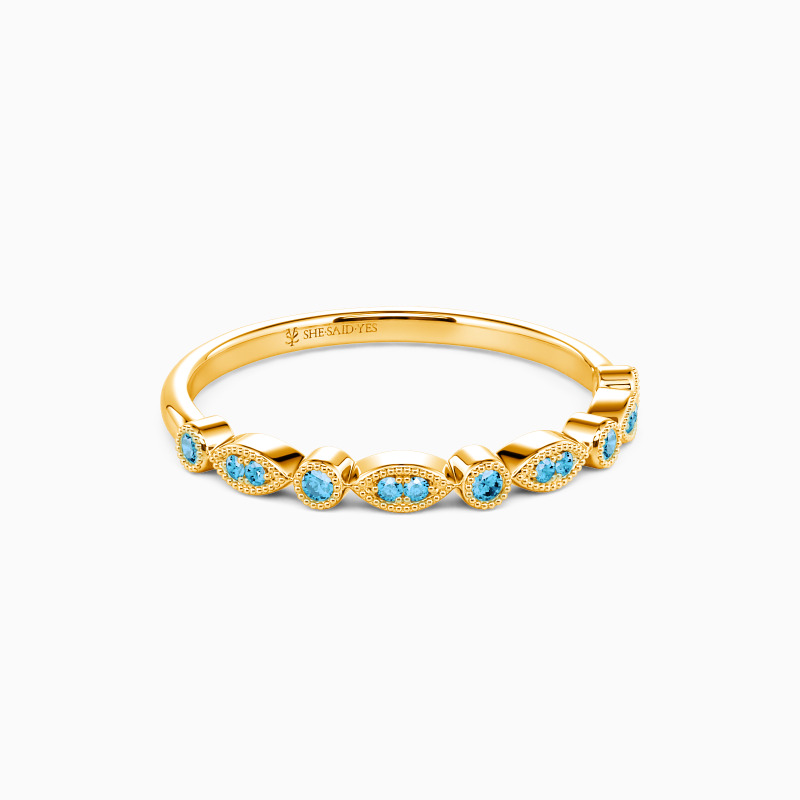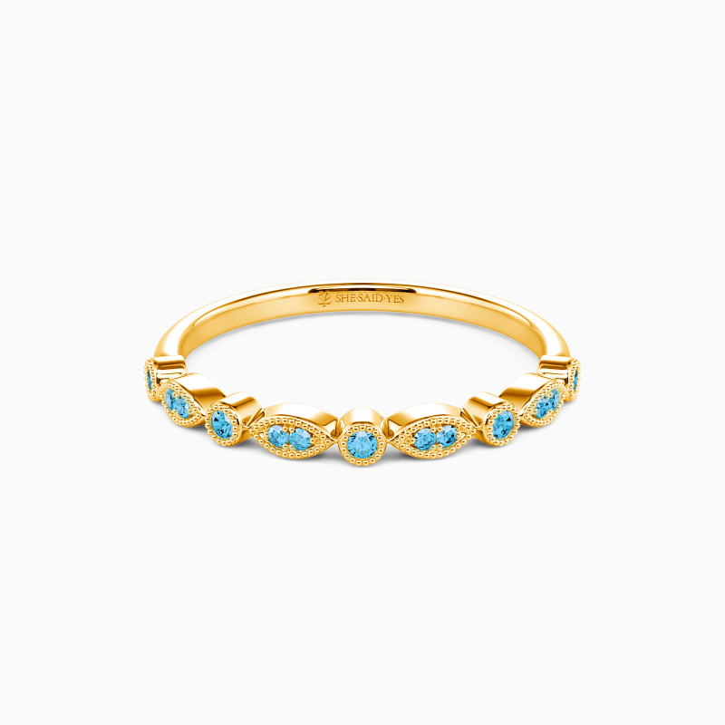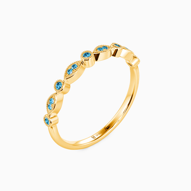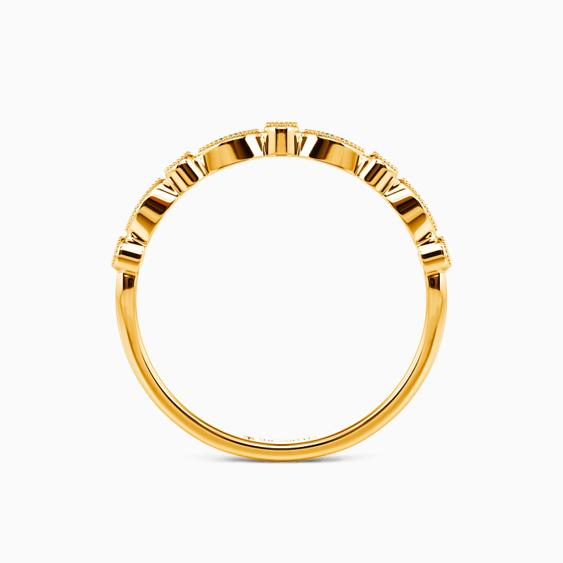 Harmonious prong setting and bezel setting form this delicate wedding band with artistry and poise. And the tiny round stones are studded in each frame to shower some sparkle. This band is the perfect choice to stack or wear on its own.
