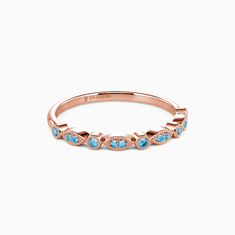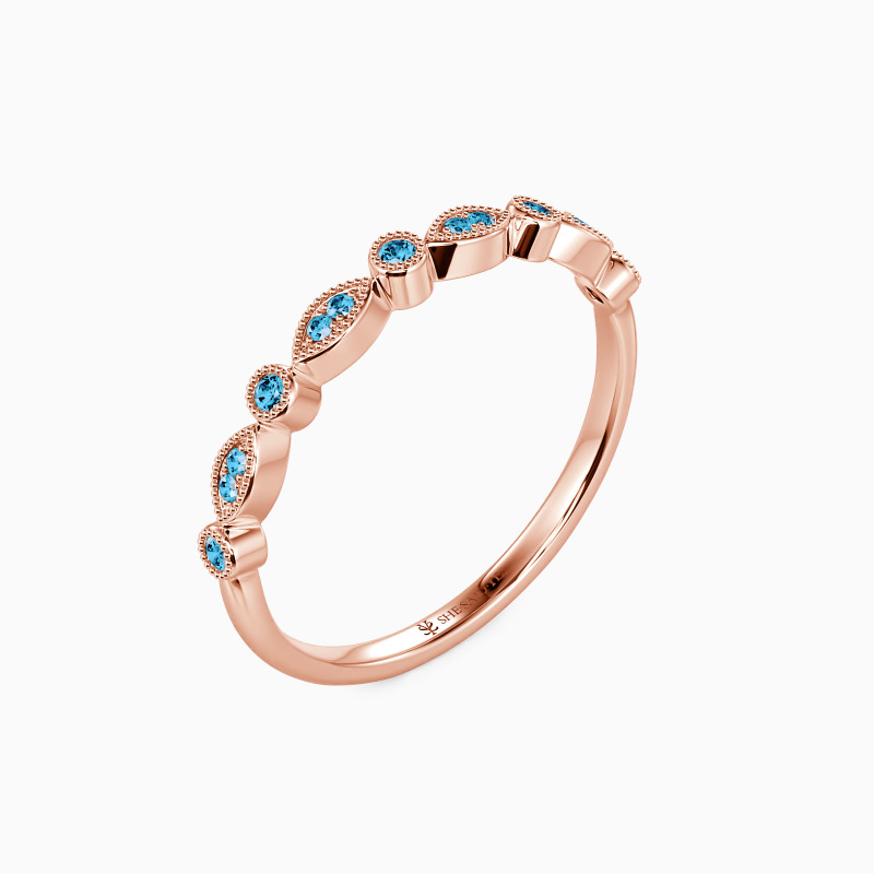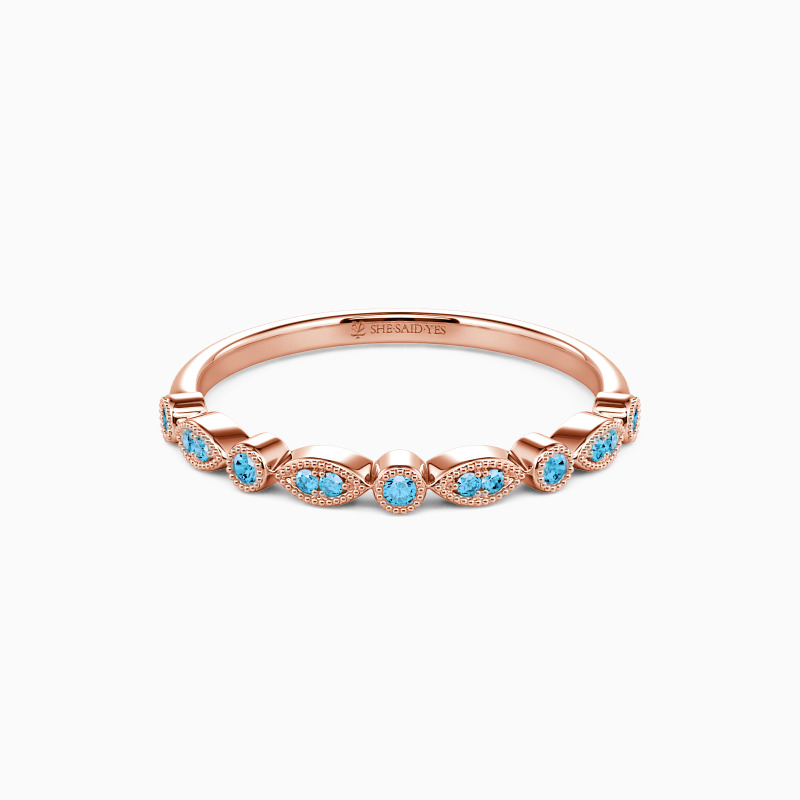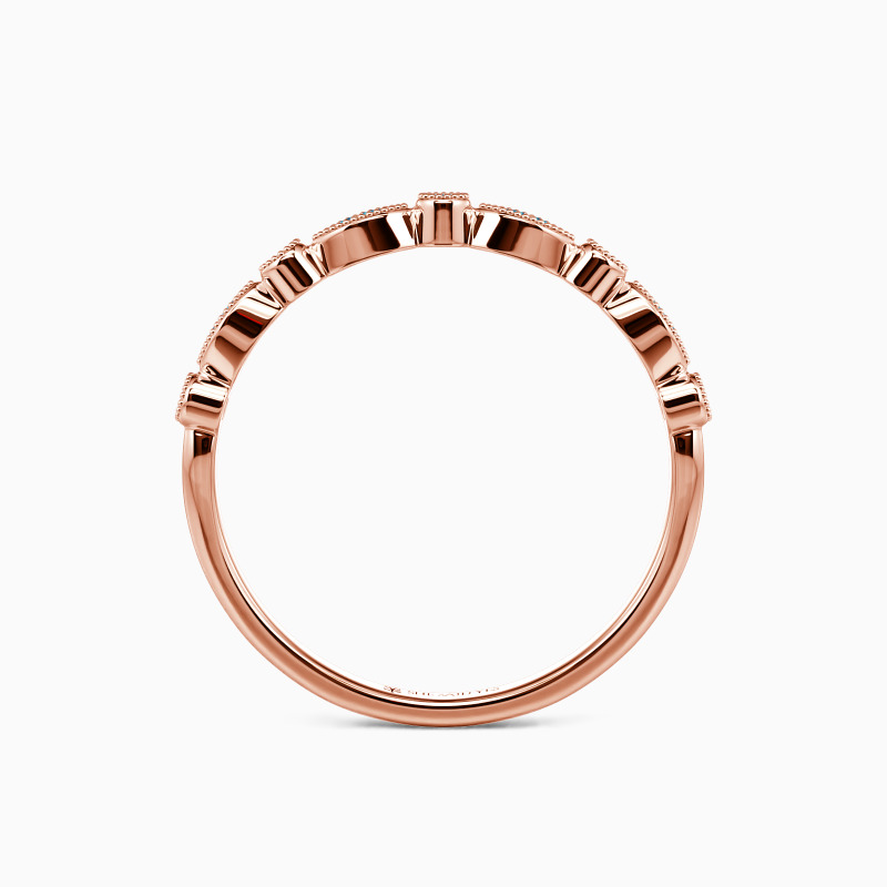 Harmonious prong setting and bezel setting form this delicate wedding band with artistry and poise. And the tiny round stones are studded in each frame to shower some sparkle. This band is the perfect choice to stack or wear on its own.