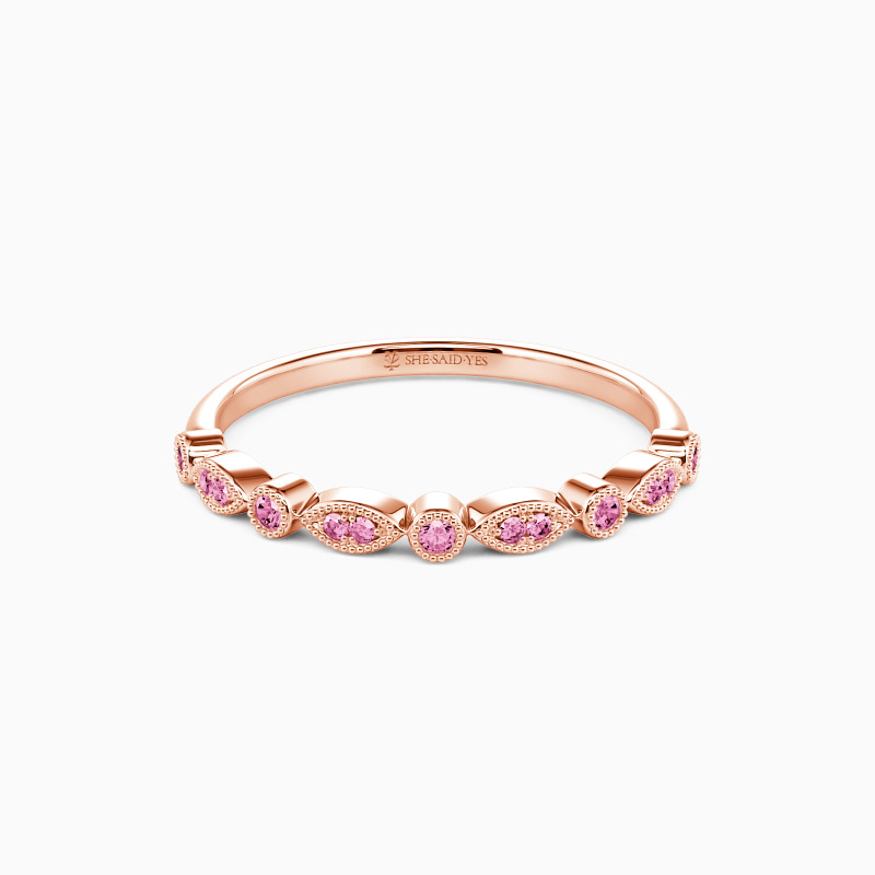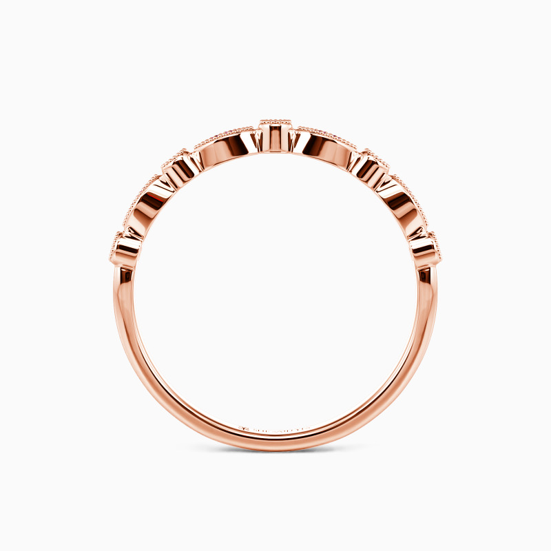 Harmonious prong setting and bezel setting form this delicate wedding band with artistry and poise. And the tiny round stones are studded in each frame to shower some sparkle. This band is the perfect choice to stack or wear on its own.