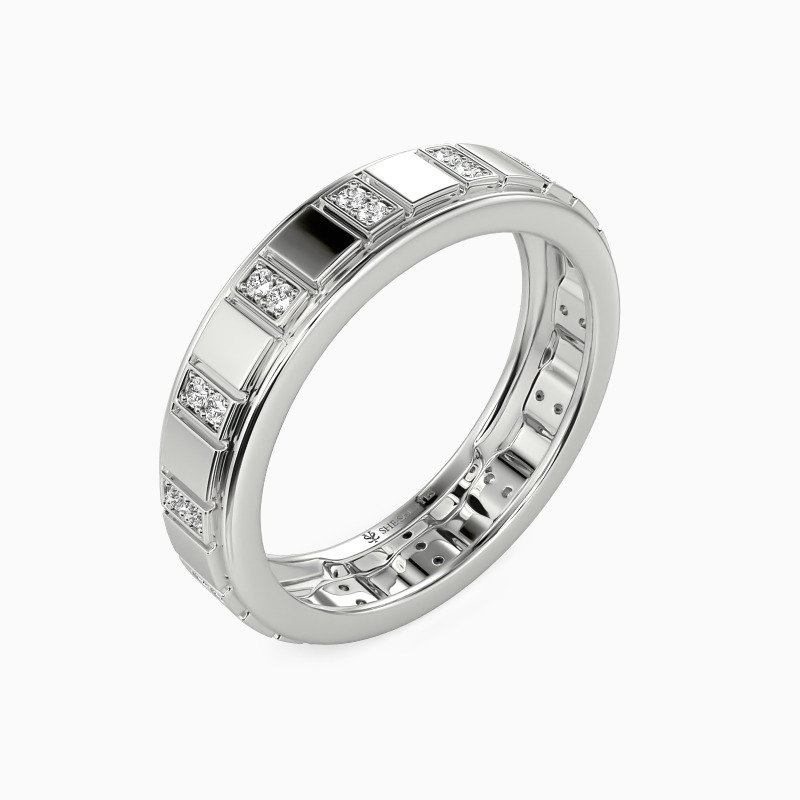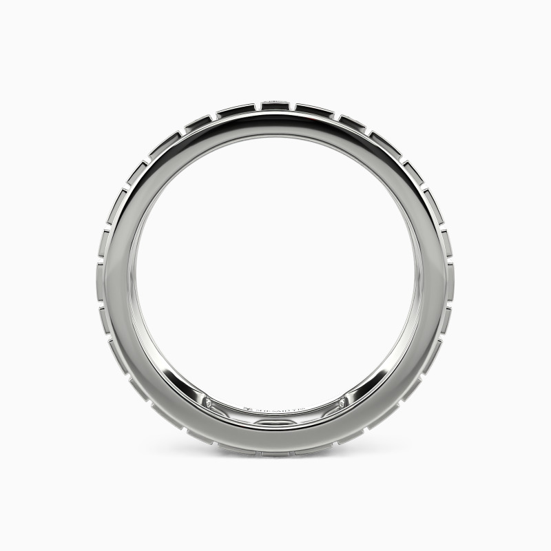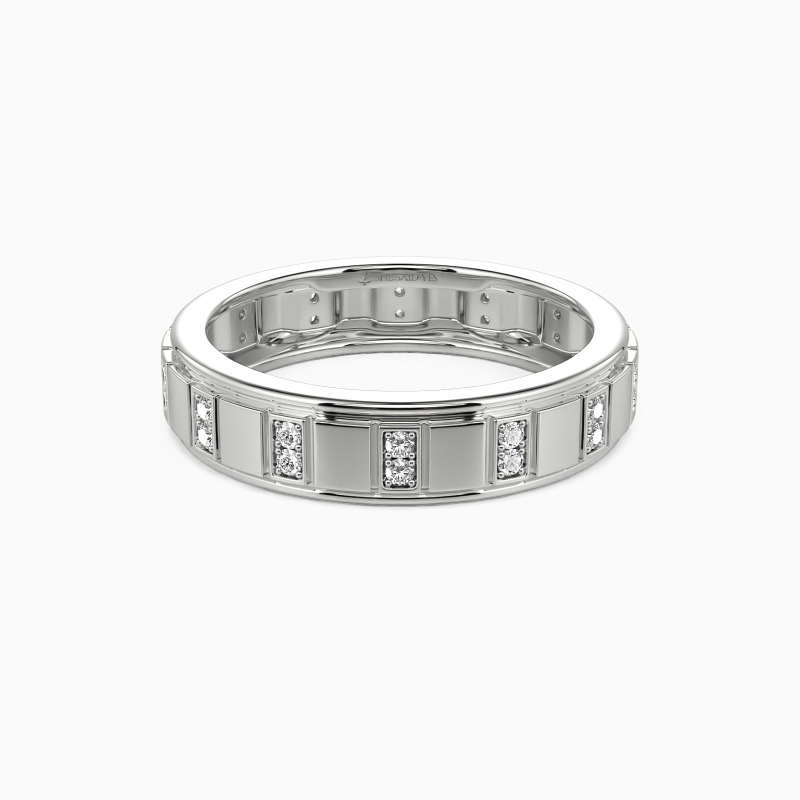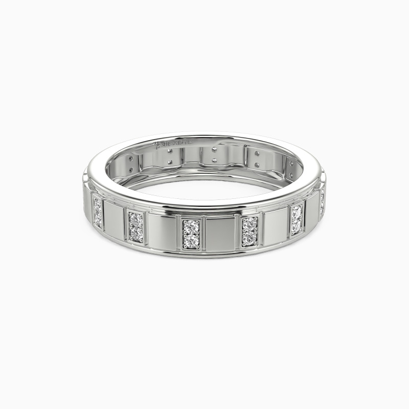 A modern band with satin touch, this wedding band is designed for witnessing your eternal love. Vertical grooves sculptured on the shank create this stunning jewelry piece. And two round-cut accents are pavéd in every vertical groove to show your scintillating glamour. You are my belief where I get strength, and I'm excited to wear this ring for you.