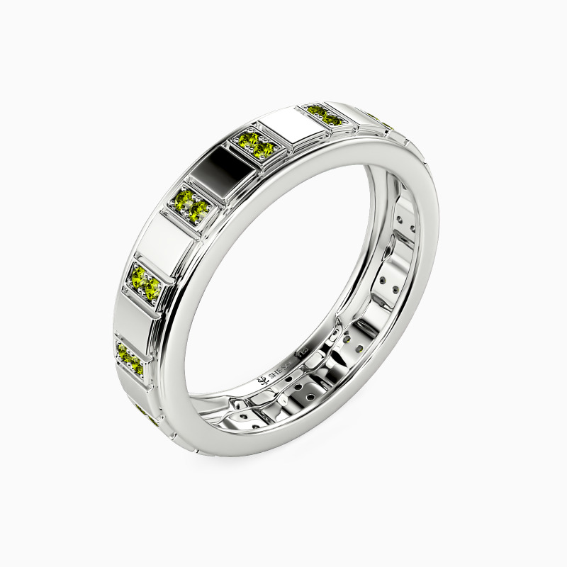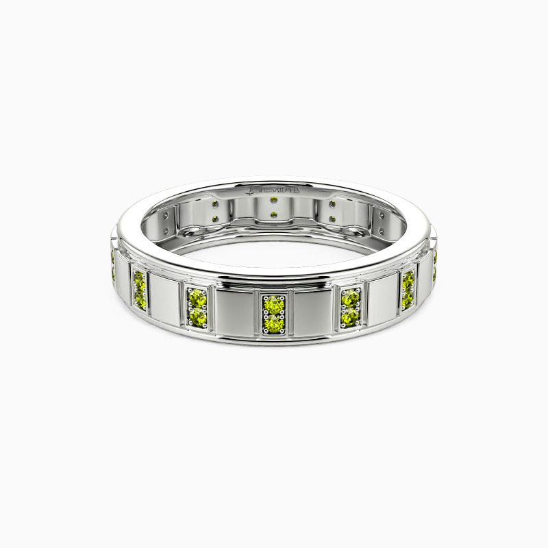 A modern band with satin touch, this wedding band is designed for witnessing your eternal love. Vertical grooves sculptured on the shank create this stunning jewelry piece. And two round-cut accents are pavéd in every vertical groove to show your scintillating glamour. You are my belief where I get strength, and I'm excited to wear this ring for you.