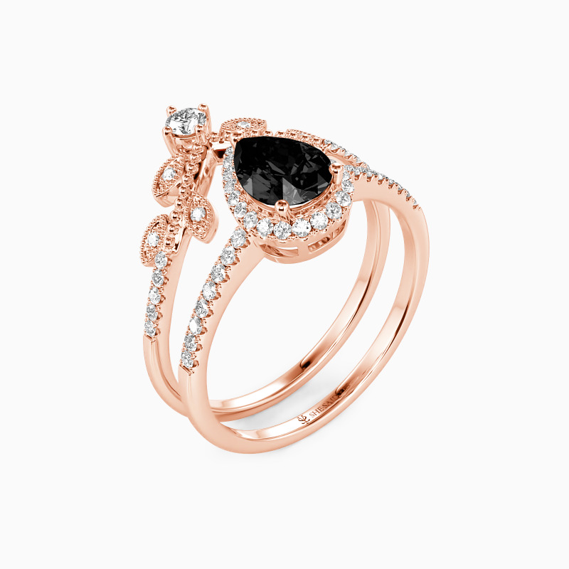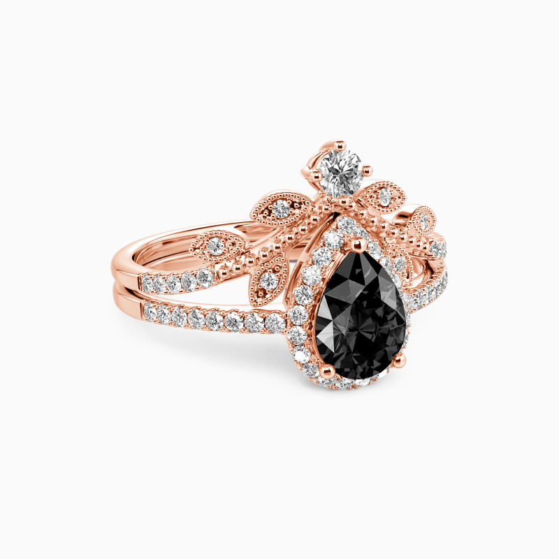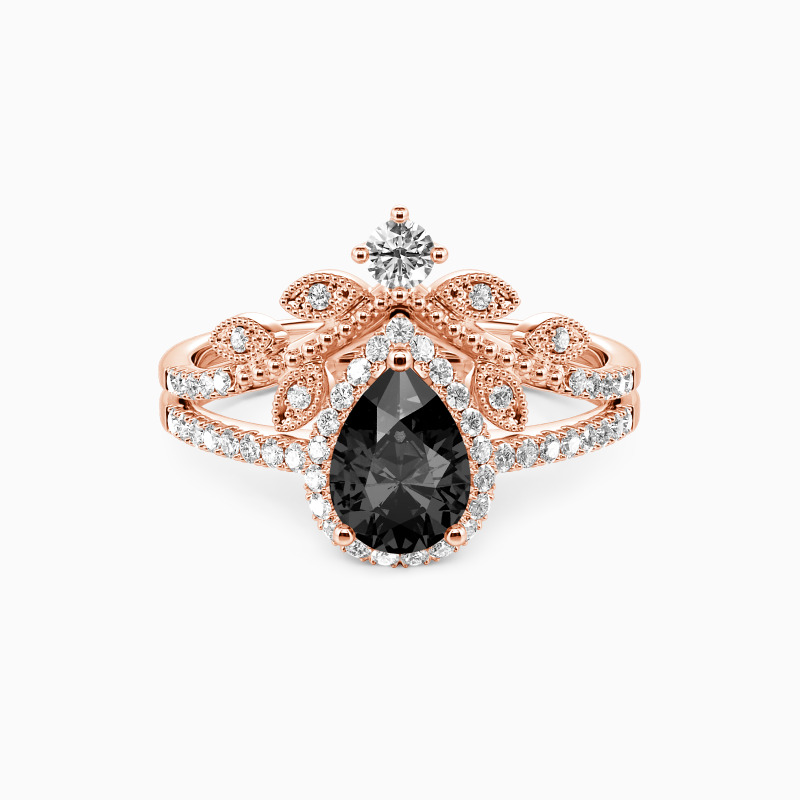 With an exceptional level of design and shimmer, this bridal set is an elevated choice for your beloved. A pear-cut center stone is wrapped in a halo frame to shine your love. And the leafy design runs along with the matching band hugging the center stone, reminding you to enjoy the natural joy in life. Such extraordinary design makes it the perfect combination for your most important ring.