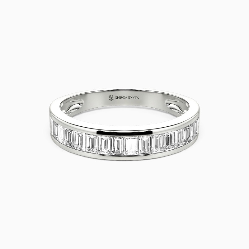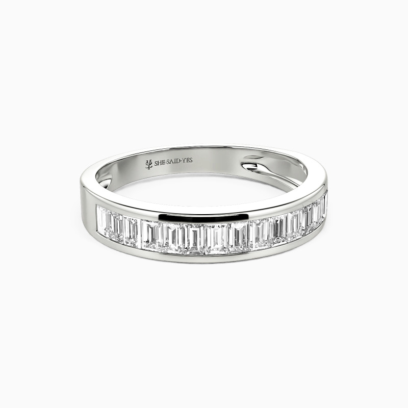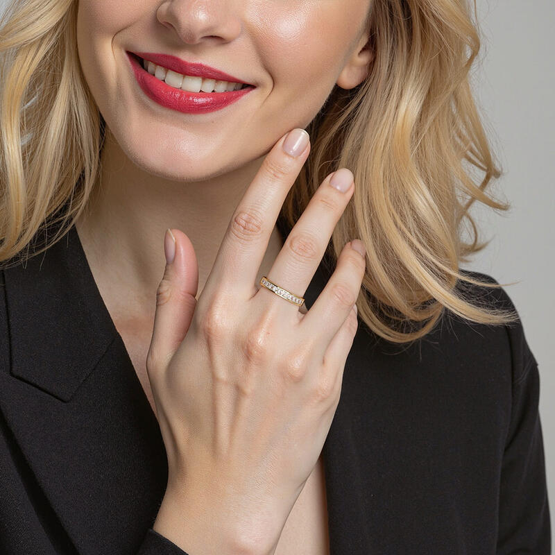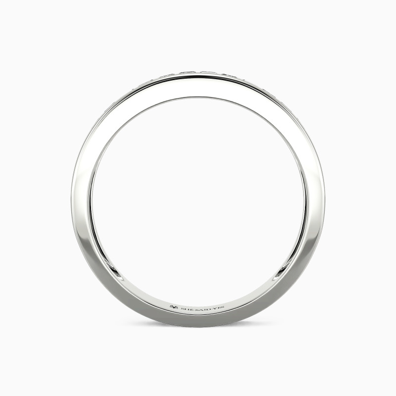 You'll never go wrong with this classic band. The channel setting creates a flat and brilliant visual effect and makes it perfect next to any engagement ring style. The whole ring showcases a radiant and striking beauty with polished edges as soon as the light hits it. Or you can wear it alone to enhance your elegant appeal.