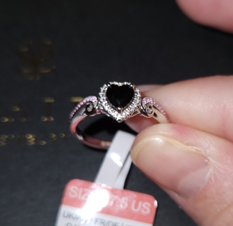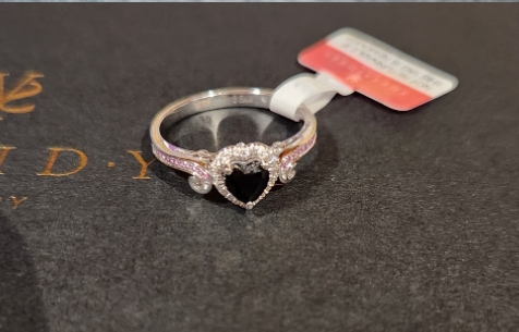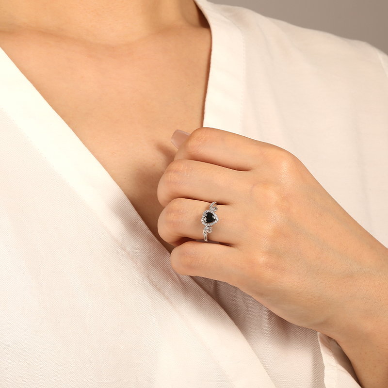 Boasts a single classic heart cut stone, hedged with glistening accents curving around the distinct heart shape we love. Additional accents shine with fire and brilliance streaming down each side in a channel setting. A symmetrical and curved band completes this enchanting engagement ring. She will cherish your love as it is precious.