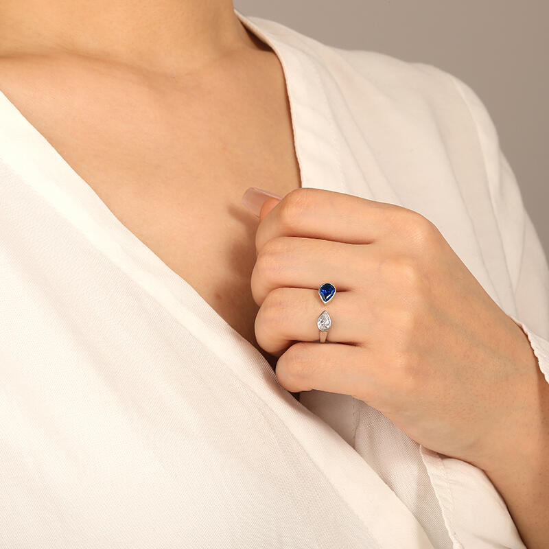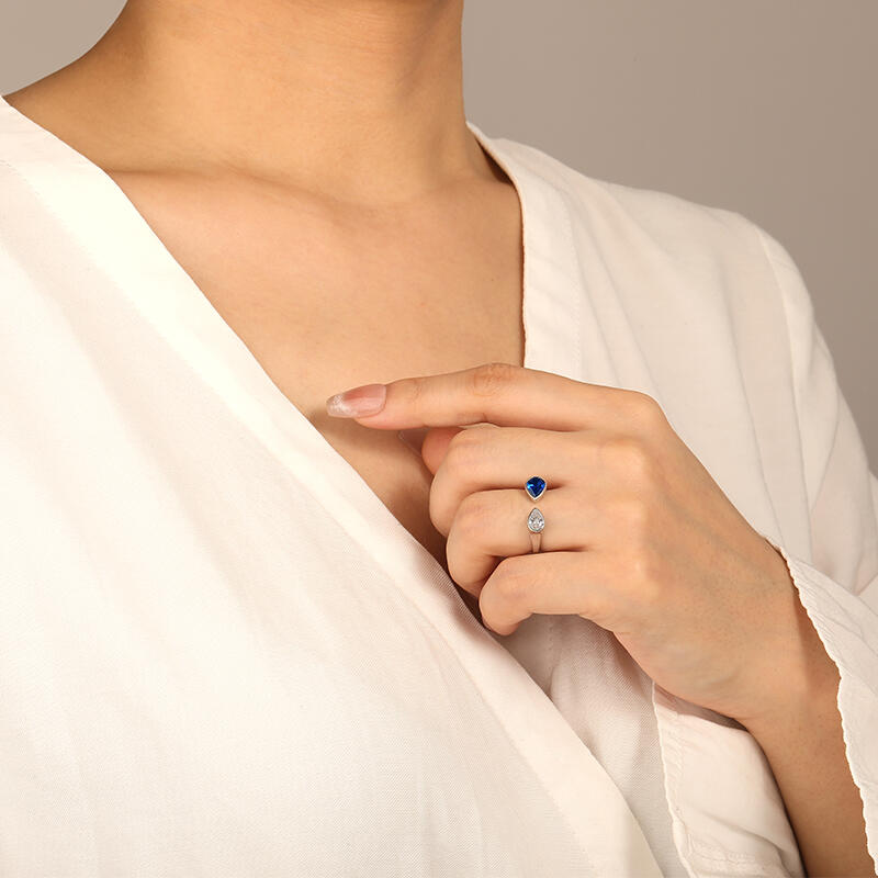Distinctive and stylish. Featuring various sizes in the same cut, the two pear-cut stones shimmer in their way oppositely in the elegant shank. Infused with simplicity and timelessness, this ring brings a touch of glamour to women. Love is the union of two opposite souls.