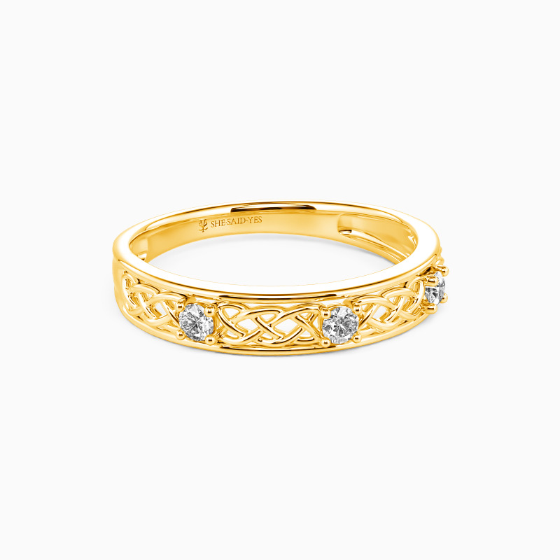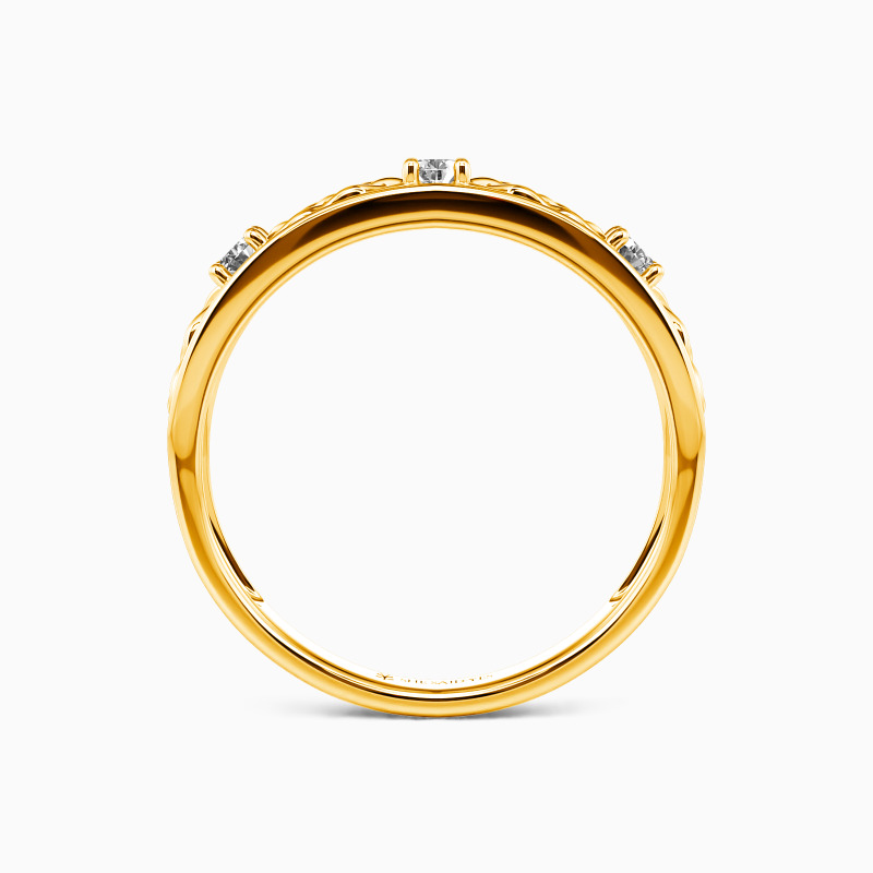 This stunning wedding band showcases three-pronged stones encrusted on a half hallow band. The rich-looking motifs add glitz and the stylish charm for the whole ring. Promise your love for a lifetime with this band, and she will come as you expected. Or you can choose to complete a splendid bridal set with it.