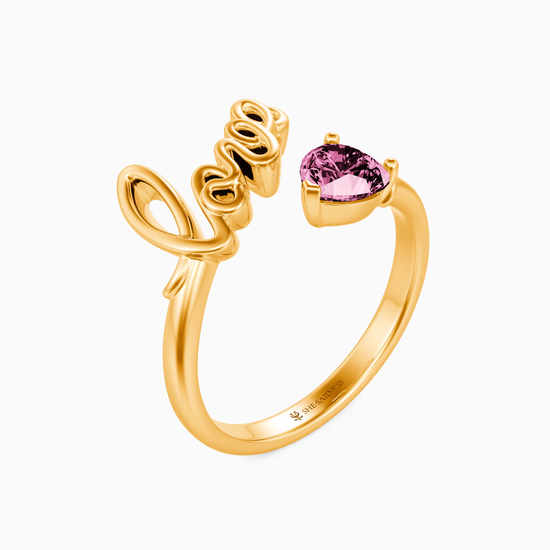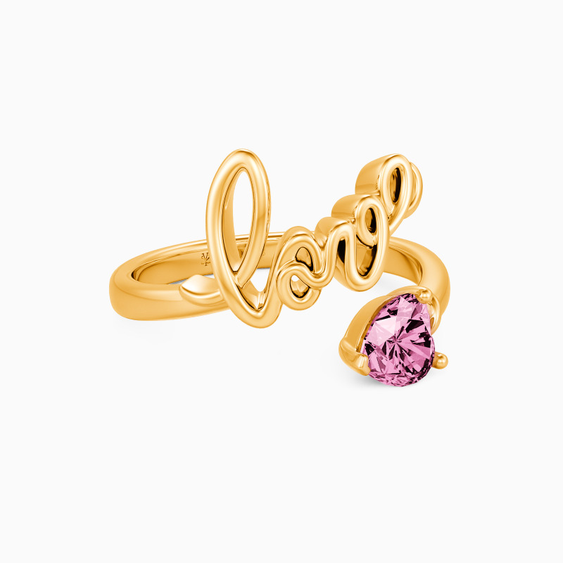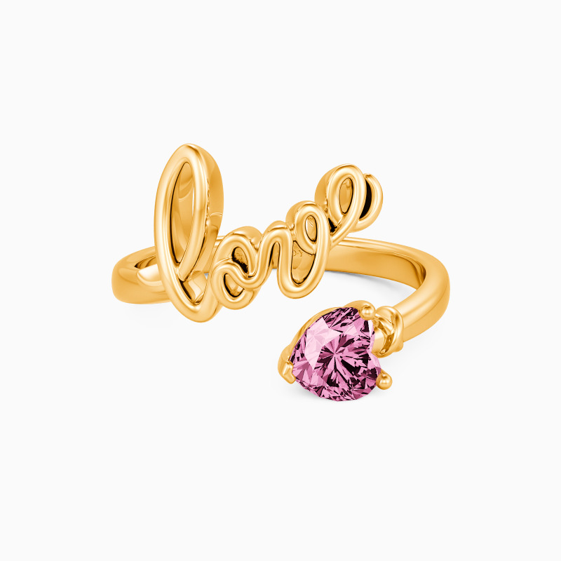 Simple, yet unique. Featuring a hand-writing love at one end and a heart-shaped stone with an arrow towards it. This charming open ring is full of love and details. In love, one and one are one.