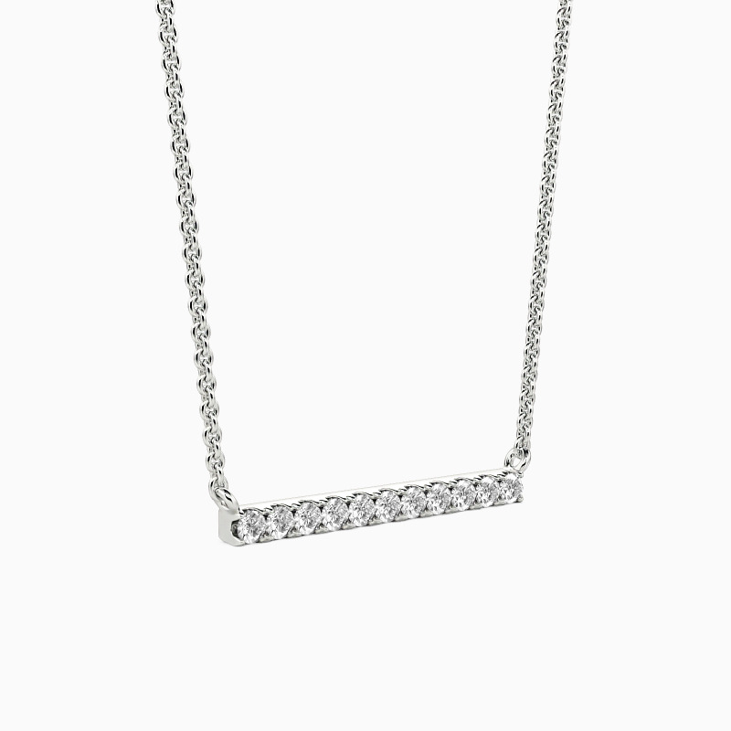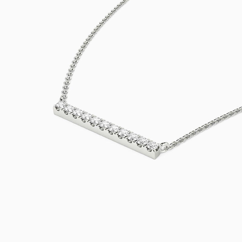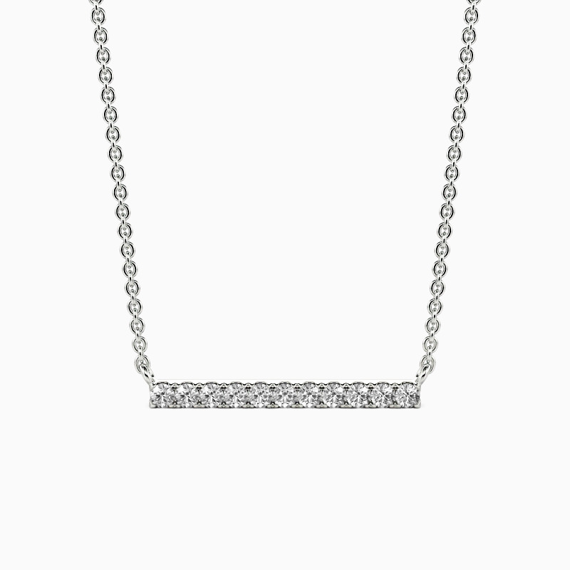 A fine series of glimmering round-cut stones in a pavé setting are displayed along a bar pendant to form this stunning necklace. It is available in your choice of metals and stones. Give it to your beloved one, and love the eternity with your eternal romance.