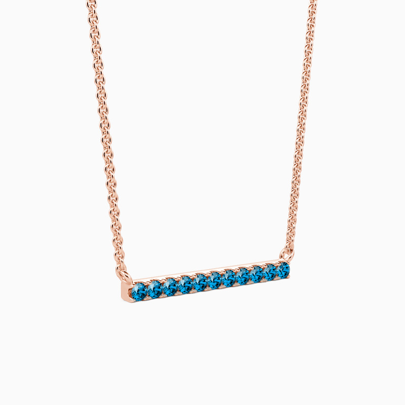 A fine series of glimmering round-cut stones in a pavé setting are displayed along a bar pendant to form this stunning necklace. It is available in your choice of metals and stones. Give it to your beloved one, and love the eternity with your eternal romance.