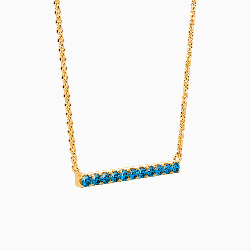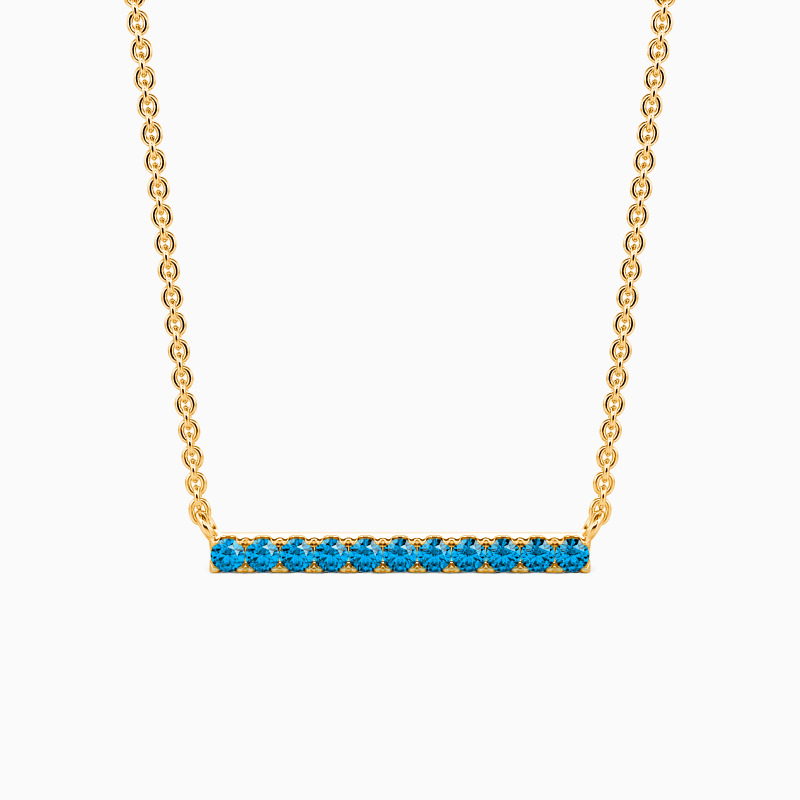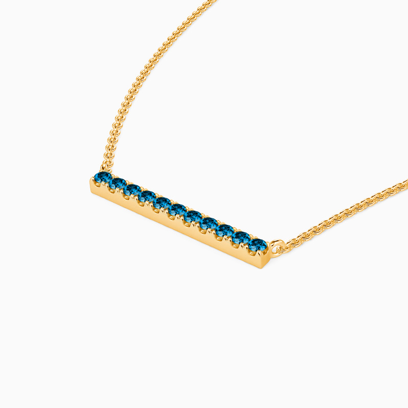 A fine series of glimmering round-cut stones in a pavé setting are displayed along a bar pendant to form this stunning necklace. It is available in your choice of metals and stones. Give it to your beloved one, and love the eternity with your eternal romance.