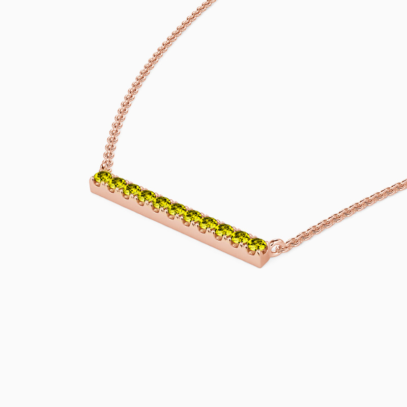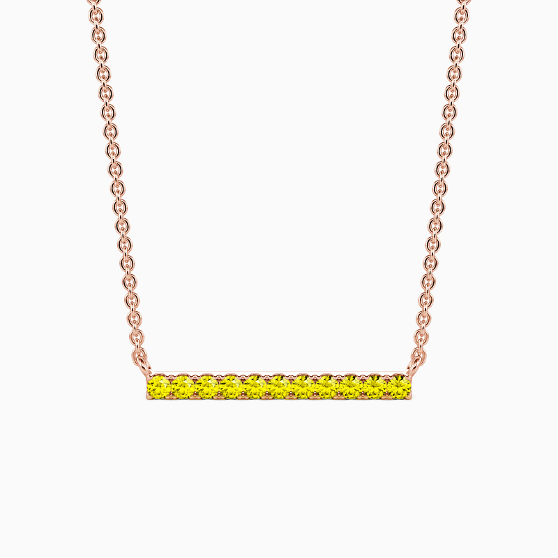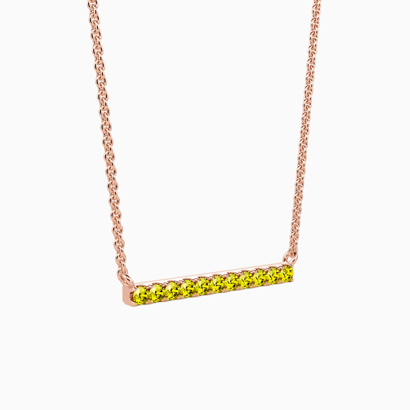 A fine series of glimmering round-cut stones in a pavé setting are displayed along a bar pendant to form this stunning necklace. It is available in your choice of metals and stones. Give it to your beloved one, and love the eternity with your eternal romance.