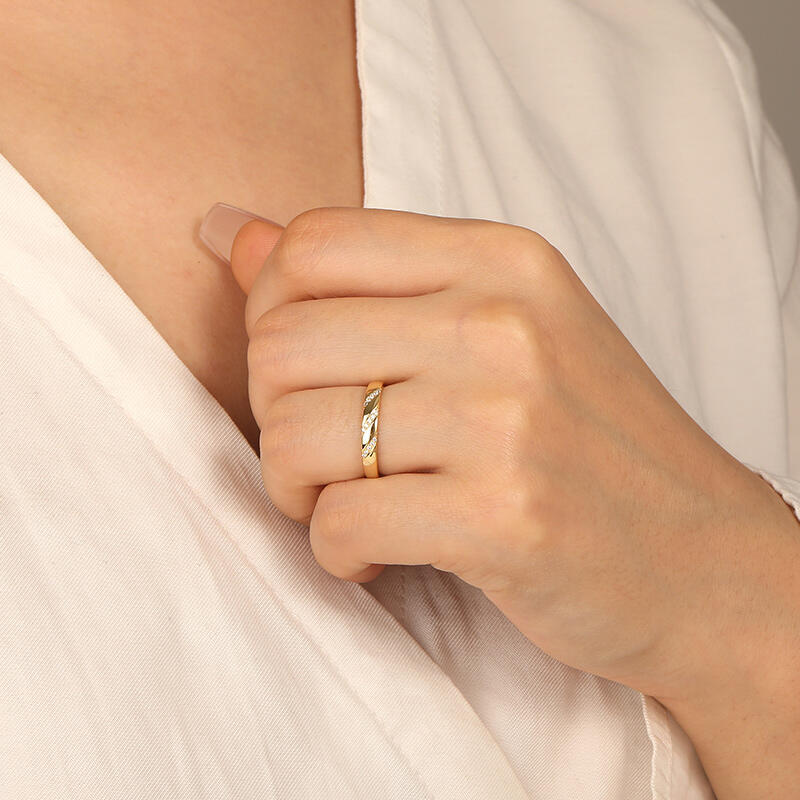 This classic band features small shimmering round cut stones nestled in a pavé setting for an added glamour and grace. The lustrous stones in a simple metallic shank, befit for a match with an engagement ring or a standalone piece.
