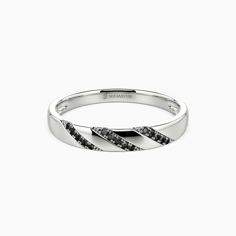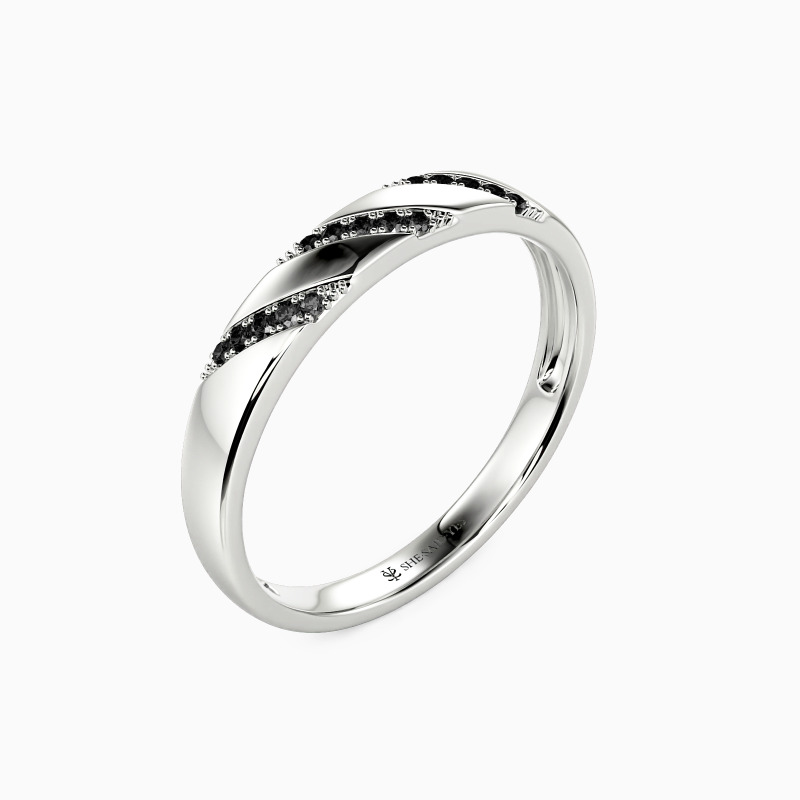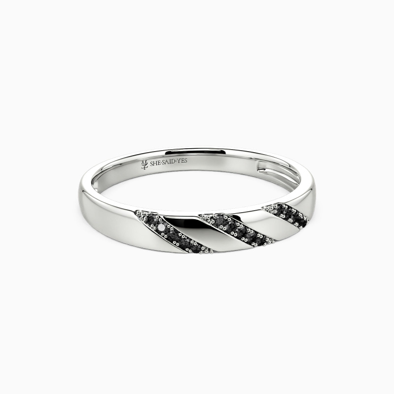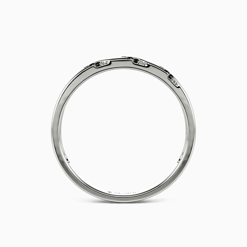 This classic band features small shimmering round cut stones nestled in a pavé setting for an added glamour and grace. The lustrous stones in a simple metallic shank, befit for a match with an engagement ring or a standalone piece.