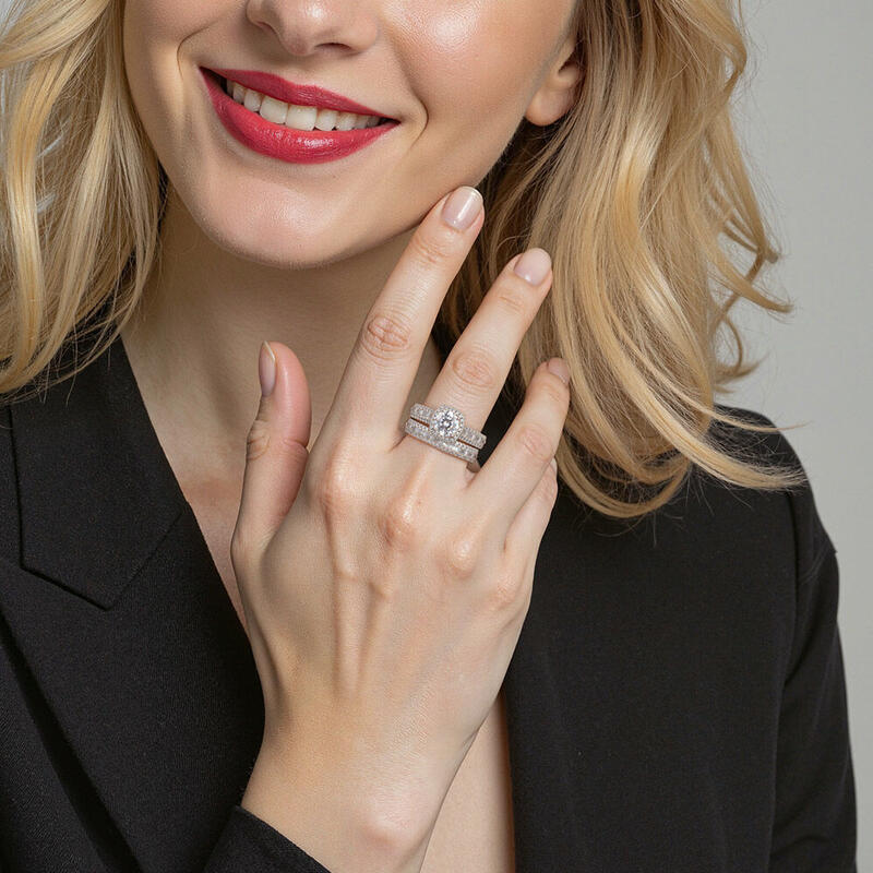 Say your "Will you" and "I do" with this sparkling bridal set. It features a round-cut center stone wrapped in a halo frame. Other smaller accents line on the shank to create a border around the centerpiece. On your special day, the coordinating three-row wedding band creates a bold ensemble. The only thing that I'll everlong ask you, you've got to promise not to stop when I say "when."