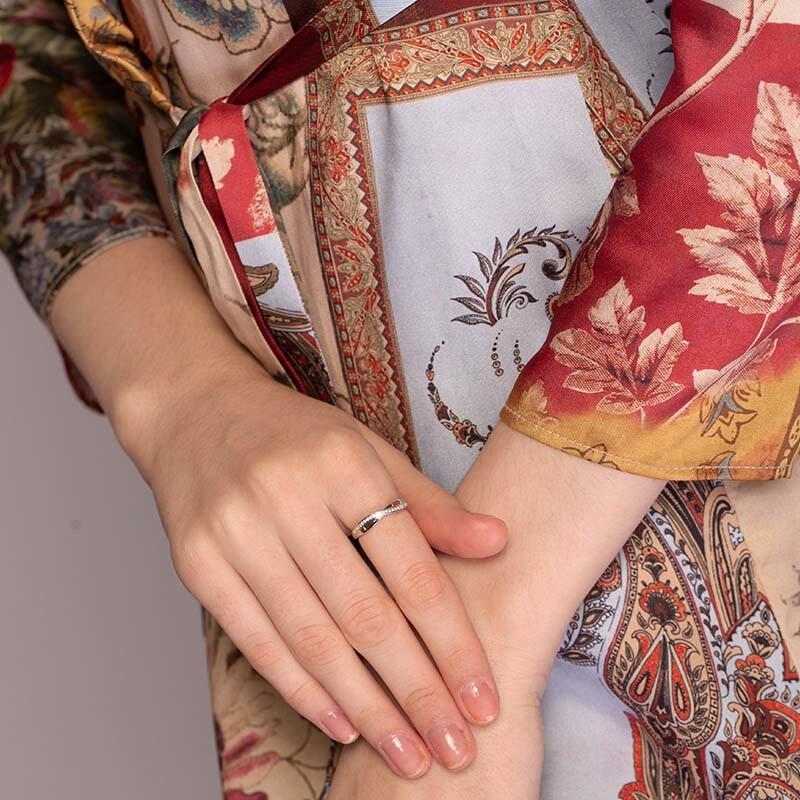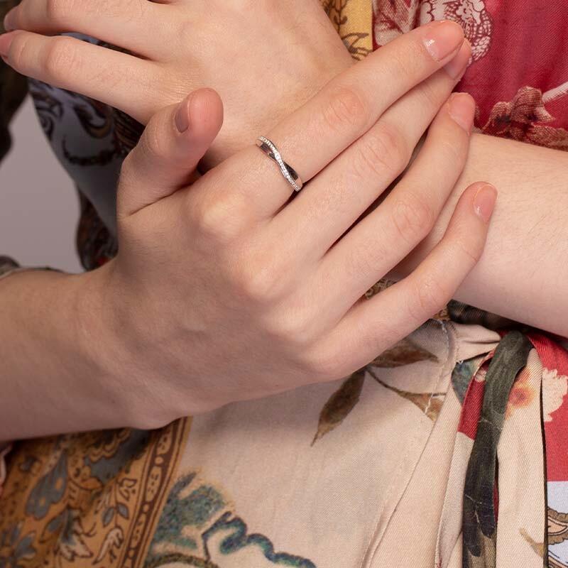 A crossover look gives this classic wedding band a captivating charm. And an exemplary sequence of glistening round-shaped accents stud in a pavé setting evokes gorgeous brilliance. Highly polished metal is designed for a minimalistic look. Pairing it with your engagement ring never goes wrong to show your elegance and beauty.