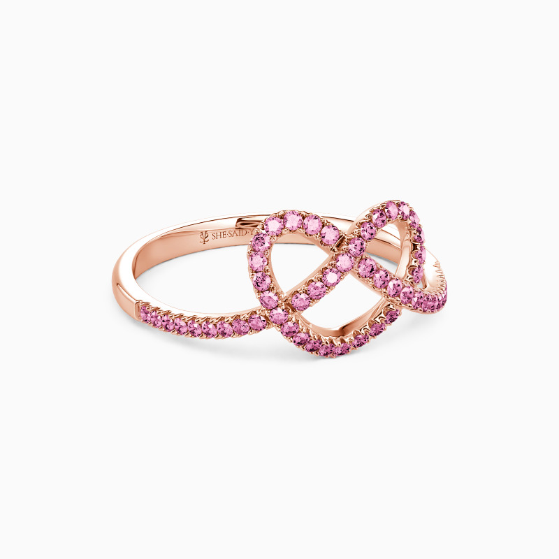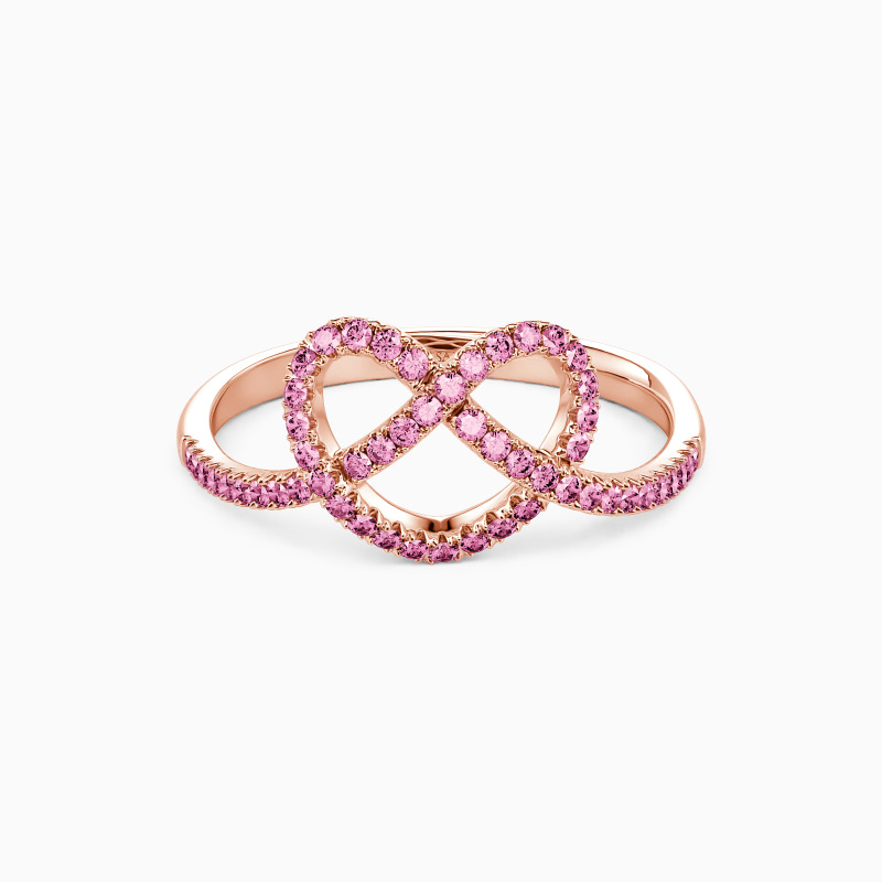 Modern and stylish. The whimsical design of this engagement ring is formed of the unique heart knot paved with various shining stones tidily stretching to the shank, expressing the timeless love and forever commitment for the one you cherished.