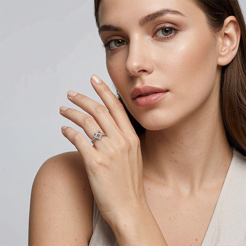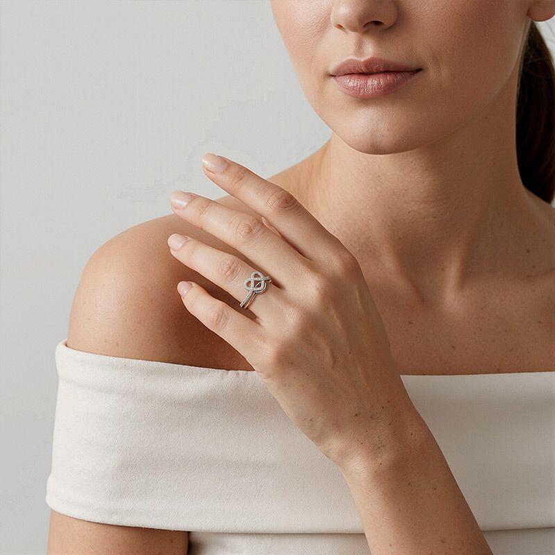The whimsical design creates a fanciful look to this bridal set. Beaming brilliantly from the heart knot frame of shimmering stones, the engagement ring shines with the half gleaming paved stone along the shank. Matching the wedding ring with a metallic lip silhouette adds an alluring style to this modern design with simplicity.