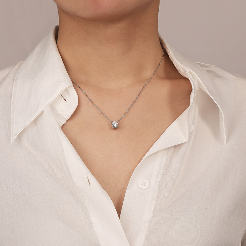A solitaire round-cut stone is nestled in a channel setting to shine brightly. The charm is suspended between the metallic chain to complete the radiance of this necklace. This simple yet fashionable design will go well with any outfit. Customize the stone you like to show your glamour.