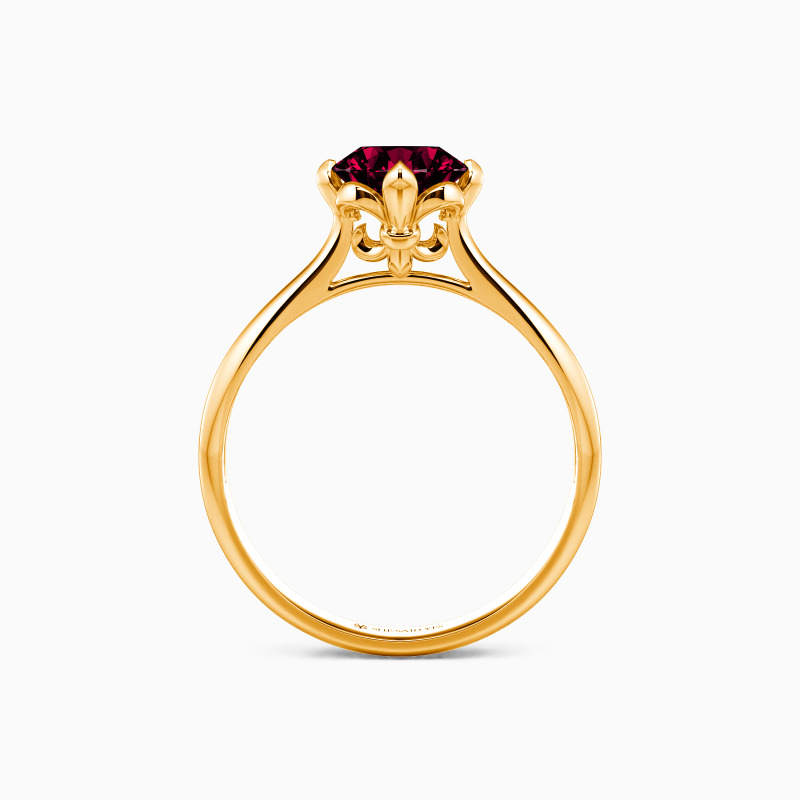 Classical and graceful. Held by the elegant setting of the fleur-de-lis, the round-cut center gem shimmers its own brilliance on the polished tapered shank. With the different widths of the shank, this solitaire ring with timeless glisten will stretch your finger and create an unforgettable memory for everyone in love.