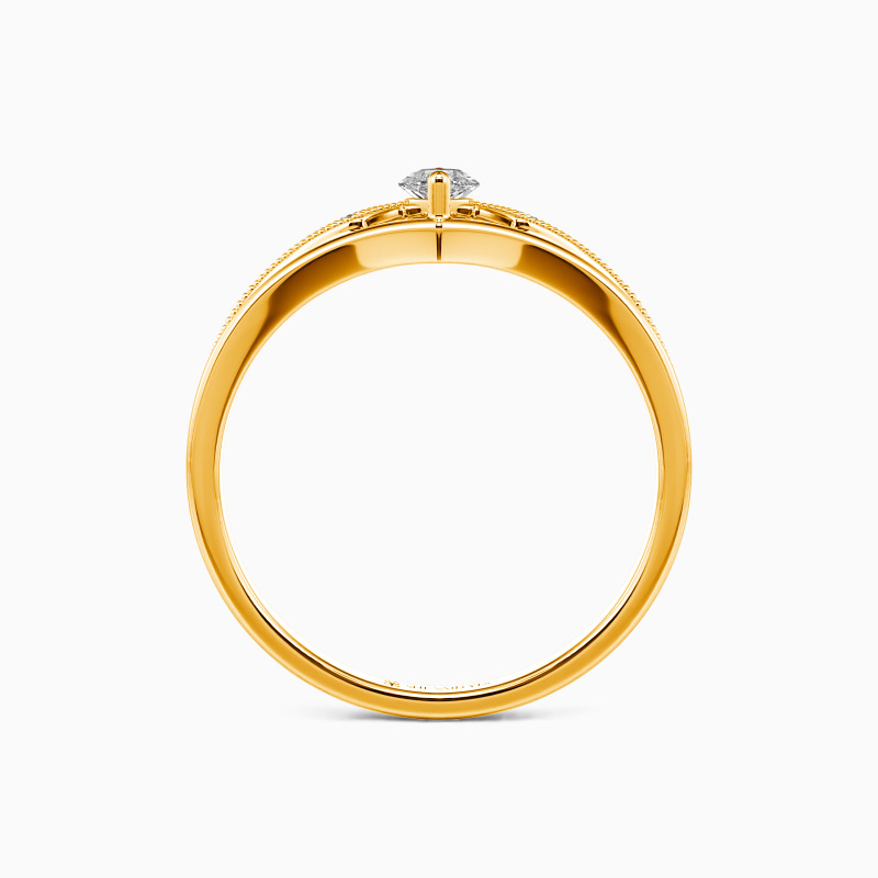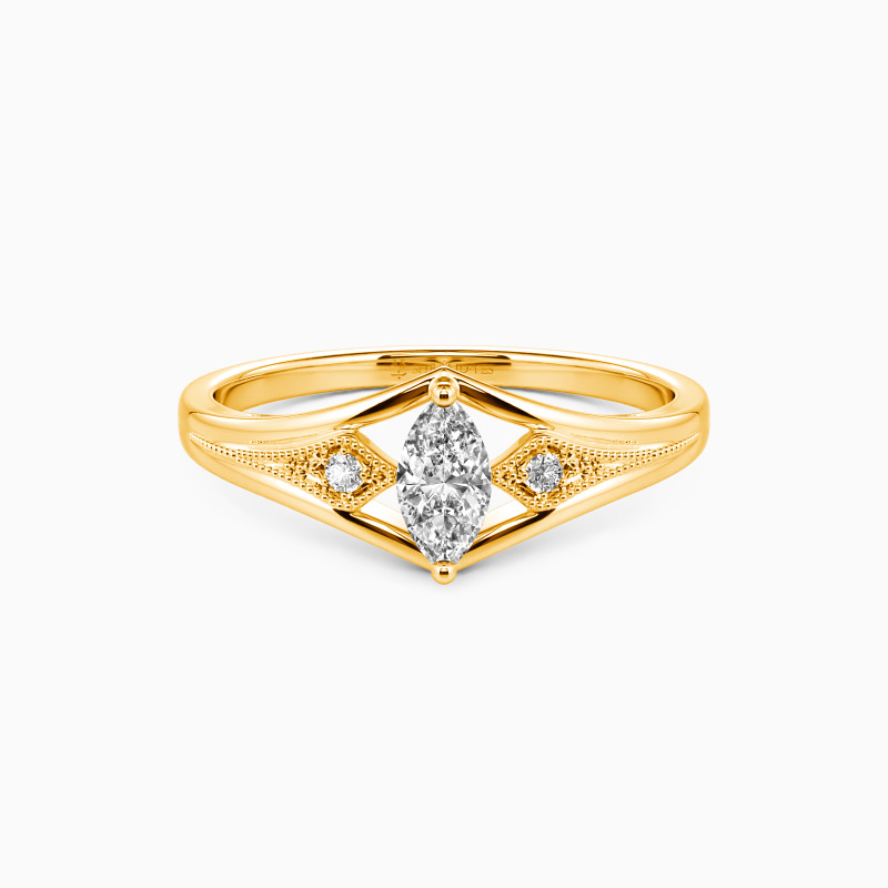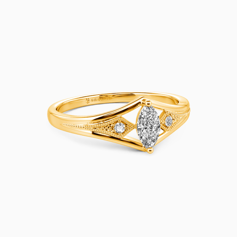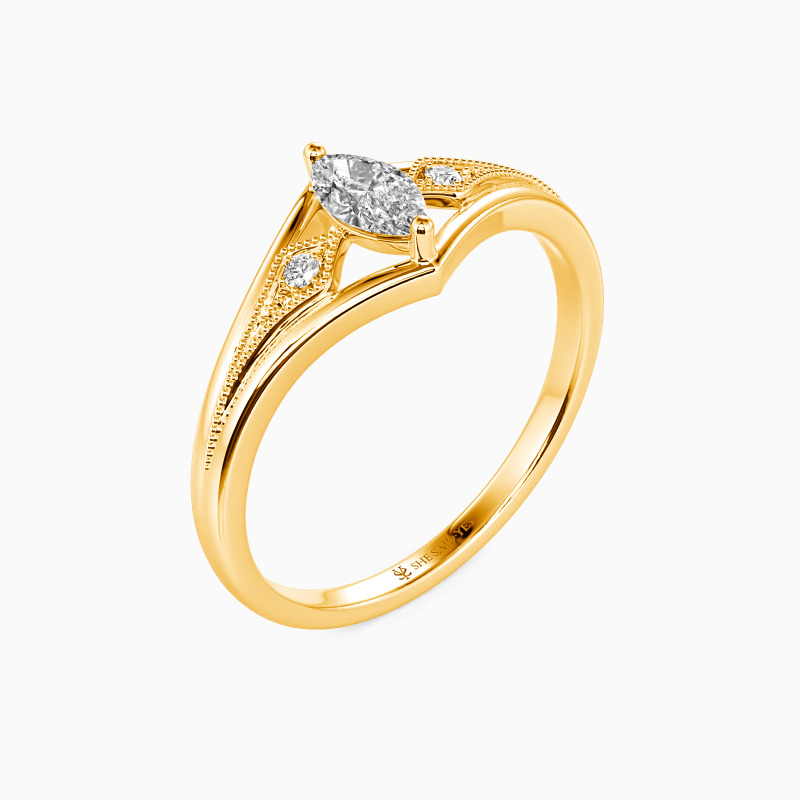 This side stone engagement ring shows a gorgeous marquise-cut center stone lifted artistically by the split shank. And two sparkling round accents are held in a four-pronged setting, bordered with a milgrain design. The creative ring brings everything aesthetic to you. Pick this ring to plan your proposal, and you will get her heart!