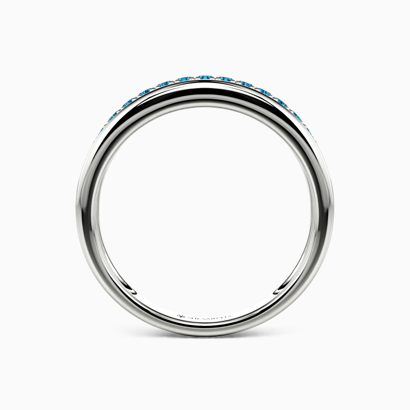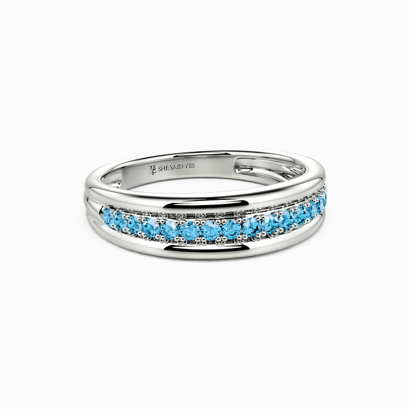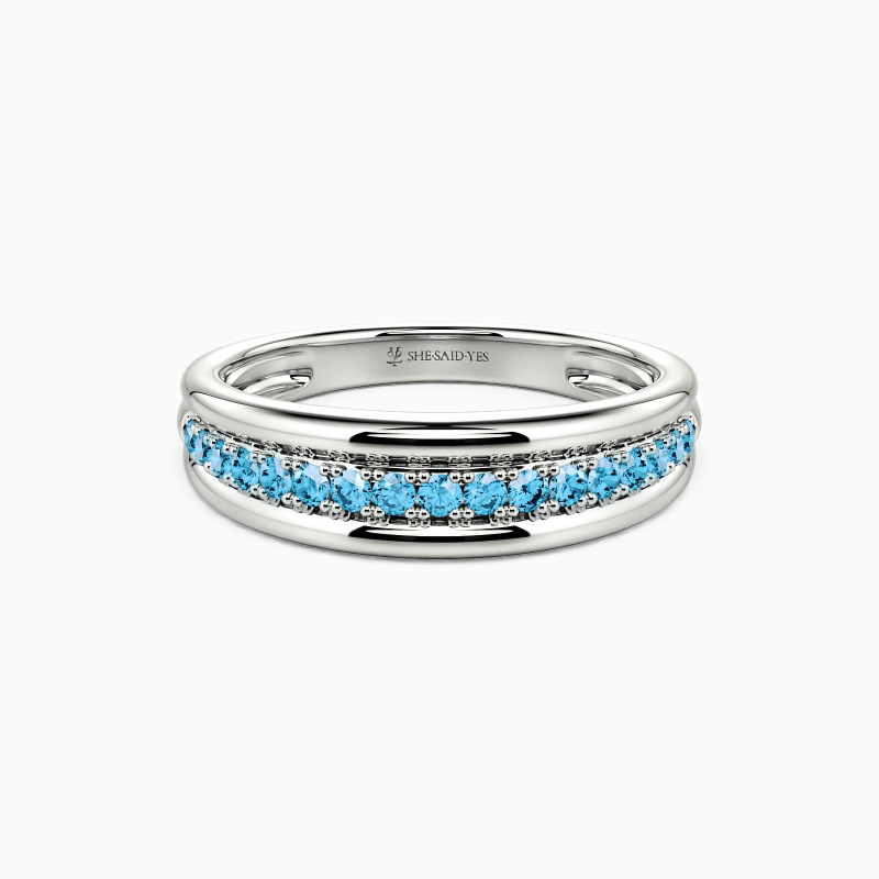A distinguished wedding band he'll treasure. This style showcases a row of pavéd round-cut stones glistening across the center. And the polished borders complete the sparkling design. It is certain to be a perfect choice for the man you adore.