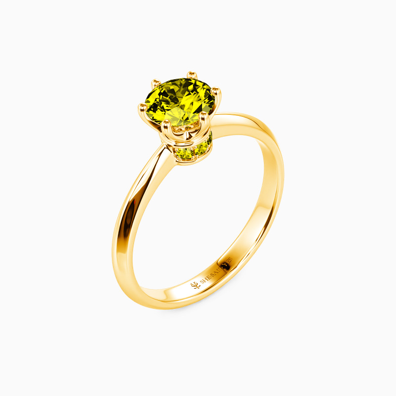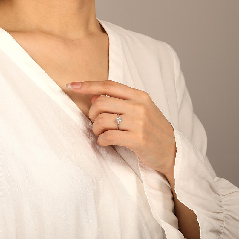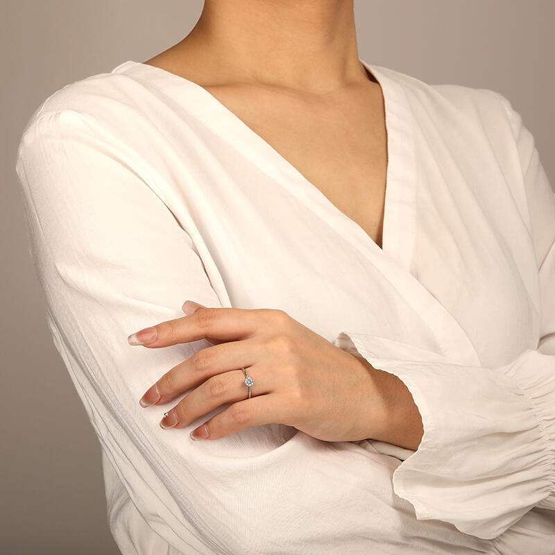Six delicate round accents are pavé-set under the head of this side stone engagement ring, lending an elegant sense to the central stone. The polished shank adds extra brilliance to the whole appearance. Both classic and contemporary, it creates an eye-catching dance of light from every angle. I put my hand on your heart, and I feel I'm alive for a purpose called you.