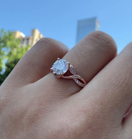 This side stone engagement ring makes you look so different with a crossover shank. Ribbons of pavé-set accents and high polished precious metal twist over each other and form a halo adding the extra brilliance of the round center stone. For the rest of my life, I'll be here with you forever.