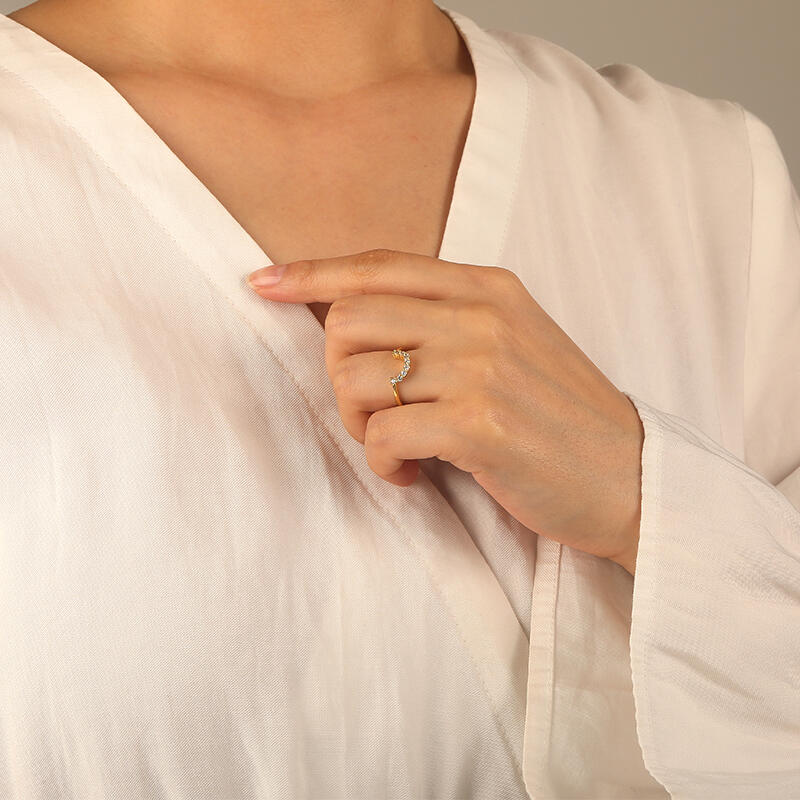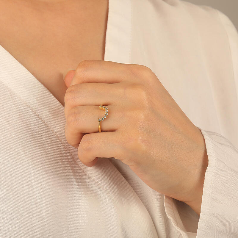 The curve of this classic wedding band situates underneath the center stone of the matching engagement ring allowing the band to pair flush against the engagement ring. All accents dance down the lustrous polished band creating a breathtaking sparkle and fire at every angle. You can also stack it with other rings to present a unique set.