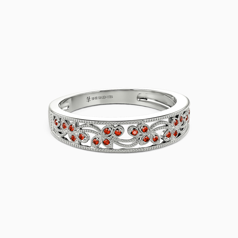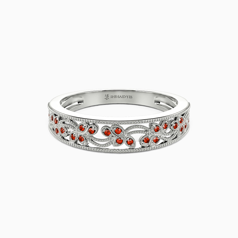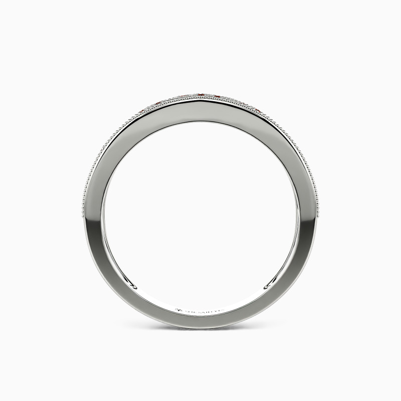 Nature-inspired design for the chic bride-to-be. This wedding band presents an aesthetic beauty with shimmering round-cut stones embellished by milgrain patterns. And stunning milgrain outlines complete this stylish but graceful wedding ring. I love you more than words can show, and this ring is the promise I give to you.