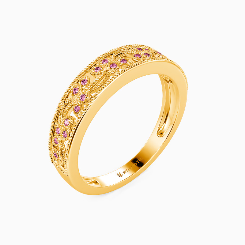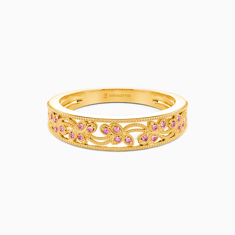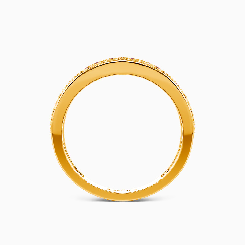 Nature-inspired design for the chic bride-to-be. This wedding band presents an aesthetic beauty with shimmering round-cut stones embellished by milgrain patterns. And stunning milgrain outlines complete this stylish but graceful wedding ring. I love you more than words can show, and this ring is the promise I give to you.