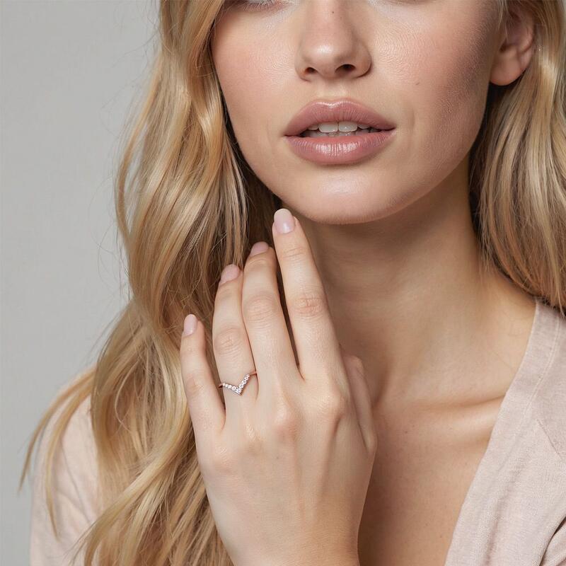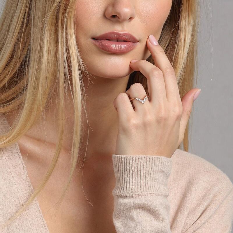 This curved ring exhibits nine sparkling round-cut stones to display glowing shine. They are held in shared prongs on the V-shaped shank. Pair it with your liking rings to match your attires and create an extraordinary daily look.
