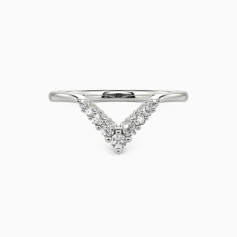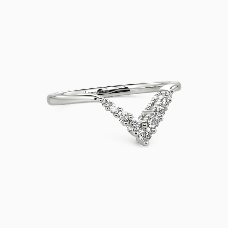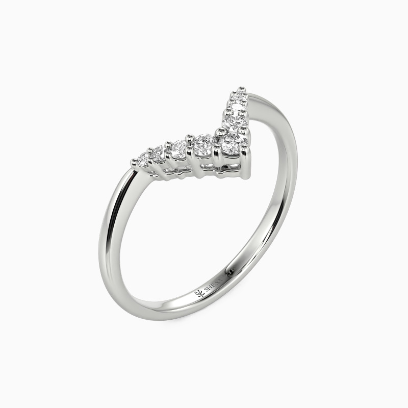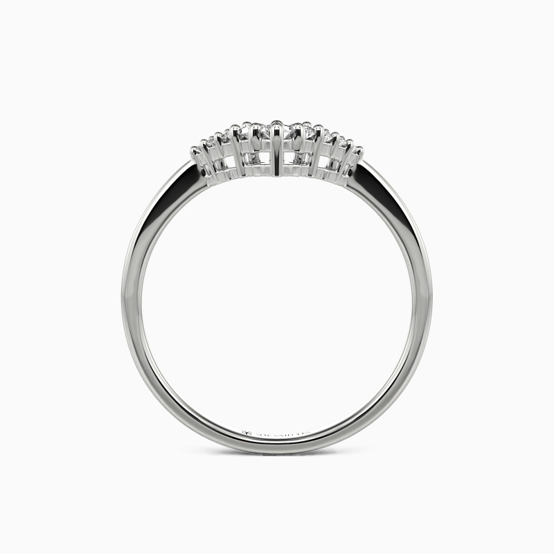 This curved ring exhibits nine sparkling round-cut stones to display glowing shine. They are held in shared prongs on the V-shaped shank. Pair it with your liking rings to match your attires and create an extraordinary daily look.