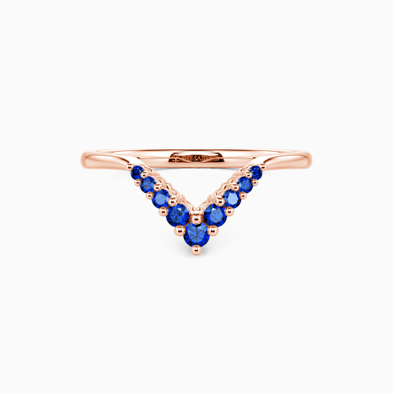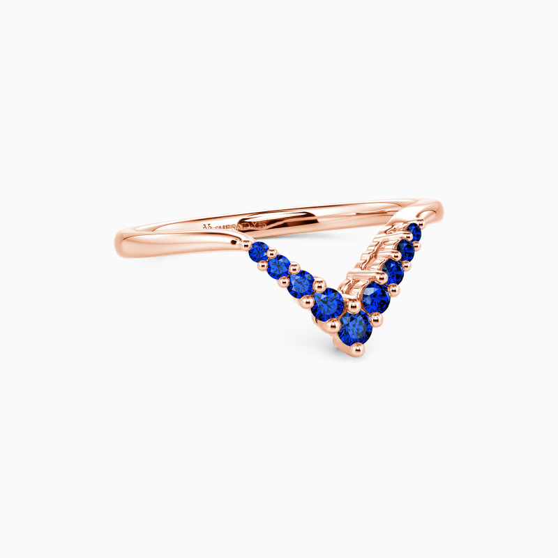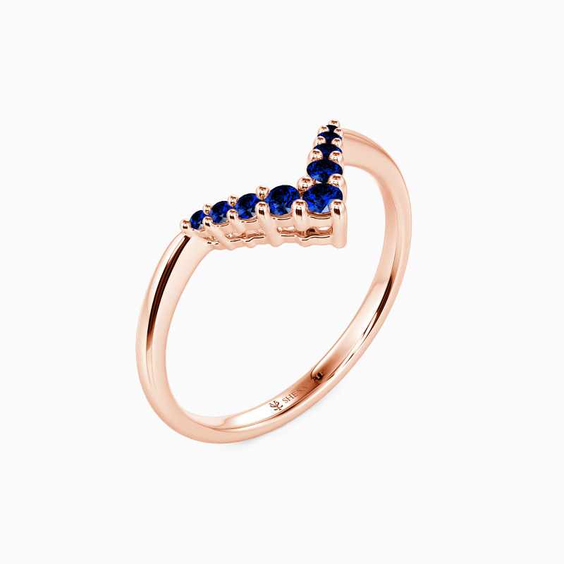 This curved ring exhibits nine sparkling round-cut stones to display glowing shine. They are held in shared prongs on the V-shaped shank. Pair it with your liking rings to match your attires and create an extraordinary daily look.