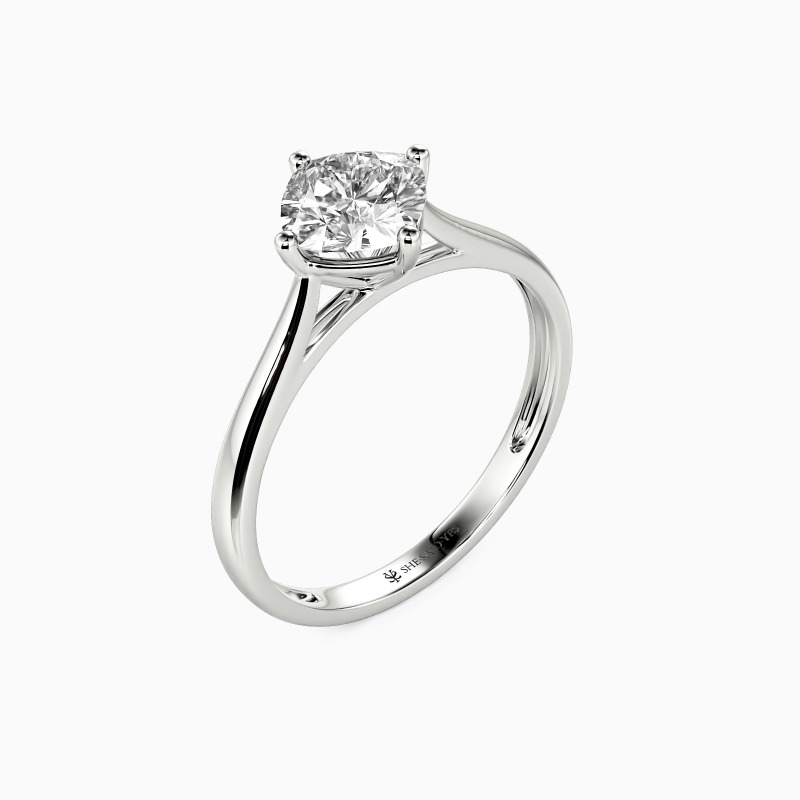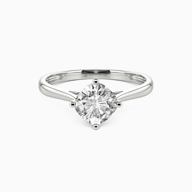 The four-prong setting gives a cushion-cut stone a fairly square look and allows more light to contact the stone, enhancing its brilliance. Give this ring to your beloved one to promise to be with her forever.