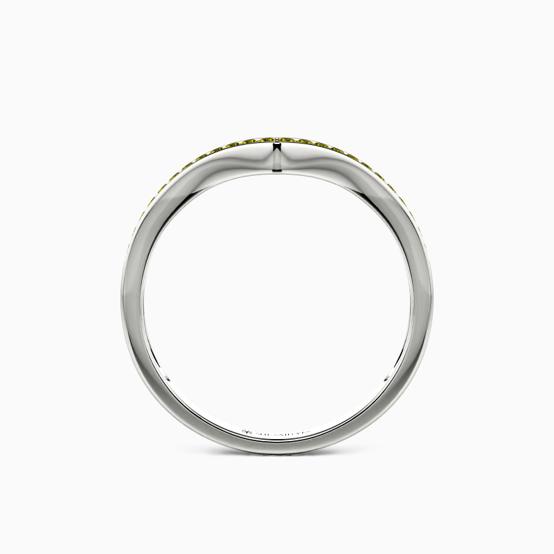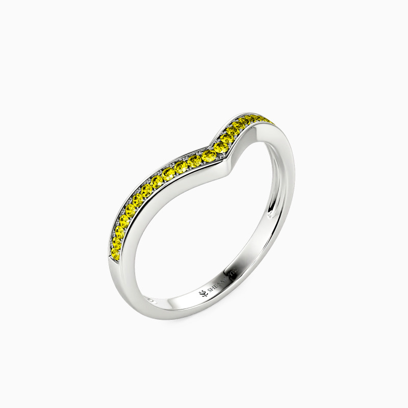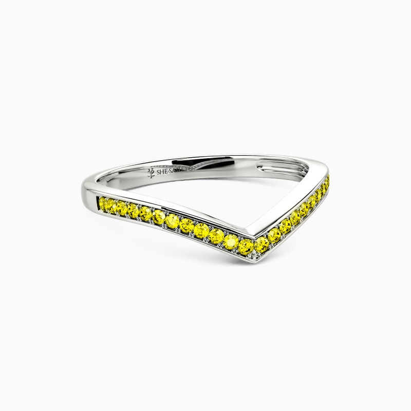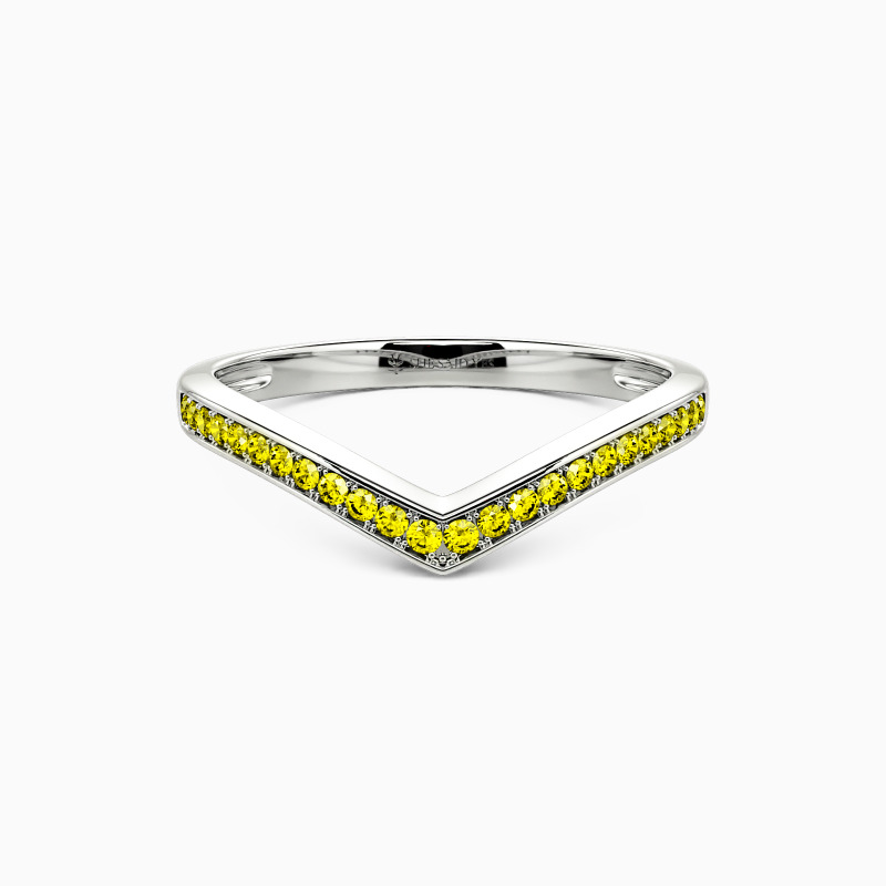 Enchants you with the stylish charm. This classic wedding band features a set of scintillating round-cut accents in a pavé setting on the V-shaped shank. Complement this marvelous piece with an engagement ring or wear it alone for a fancy impression.