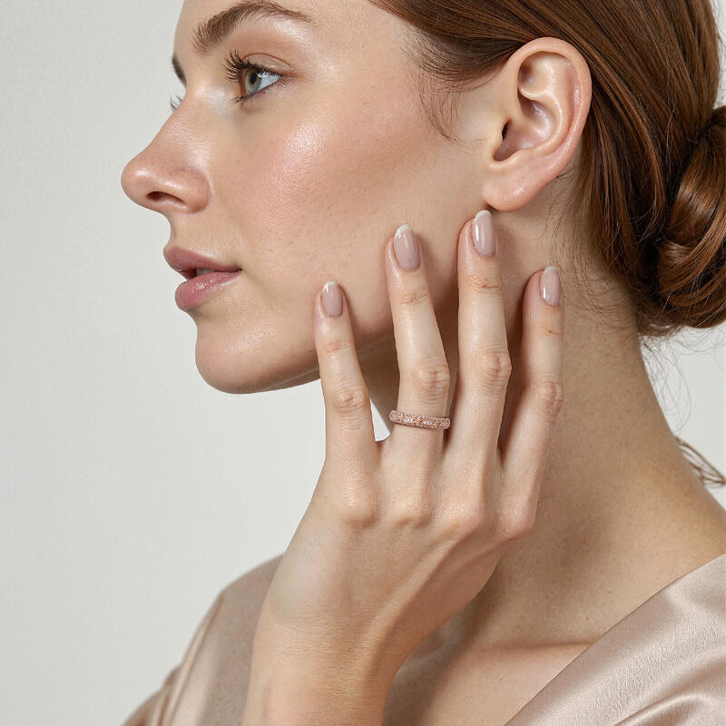 Three rows of shimmering round-cut stones are arranged to align in a pavé setting to bring you fashionable glamour. Swirling and beautiful milgrain embellishments add a splash of modern feeling, making this wedding band a must-have. I will love you until infinity runs out, and this ring is the best witness!