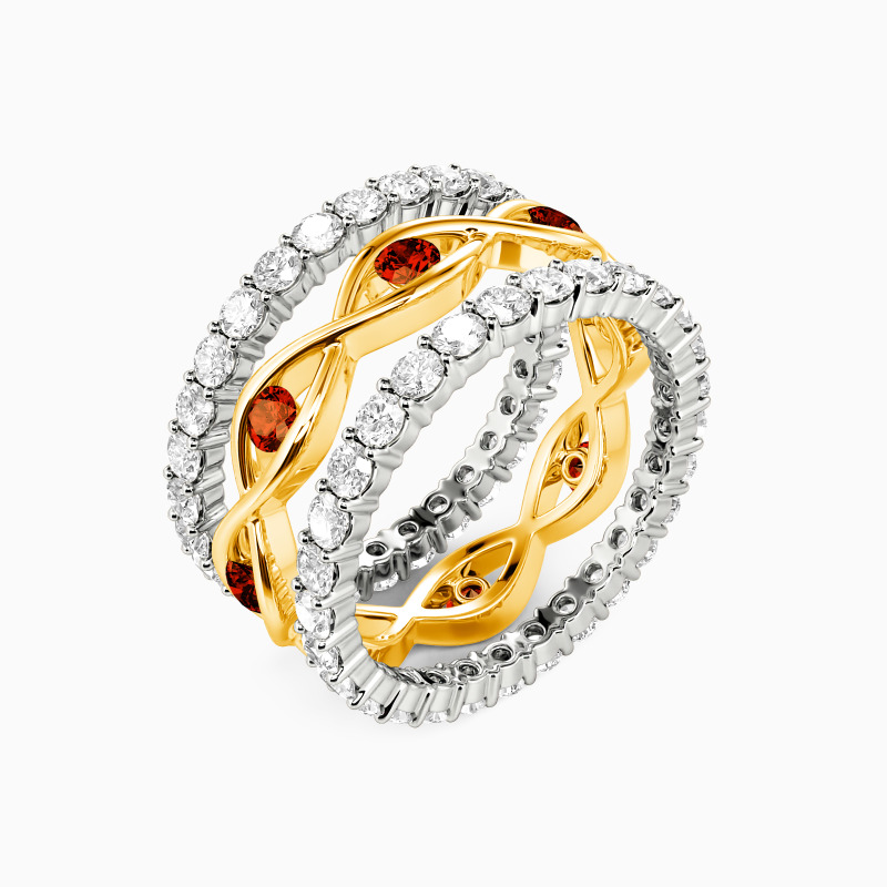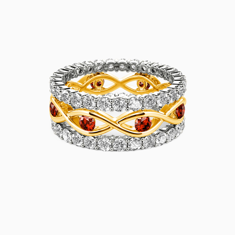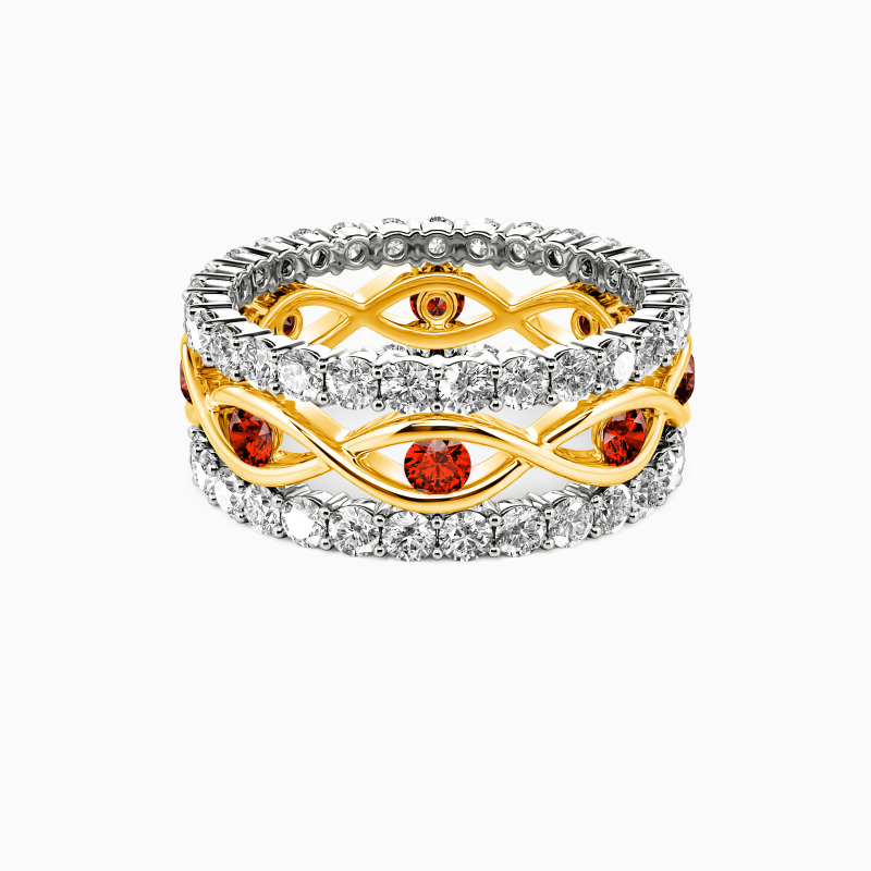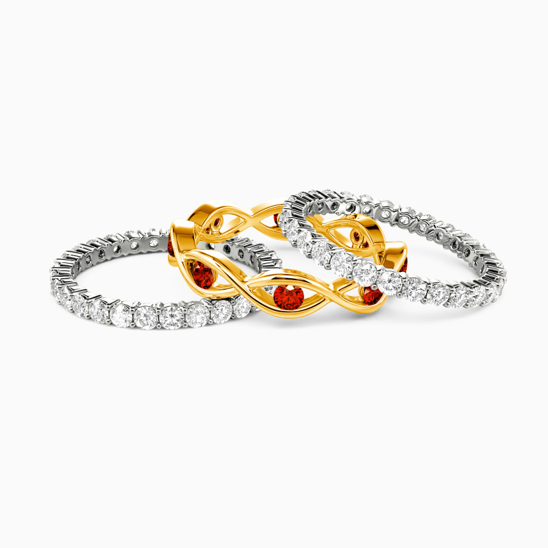 The enchanting appeal of this bridal set is reflected in its eye-catching appearance. A twisted band is set in the center to complete an exciting design. And the other two pavéd bands set dazzling round-cut accents to offer you shining beauty. I would spend one lifetime with you, and this bridal set accompanies us to face all the ages of this world together.
