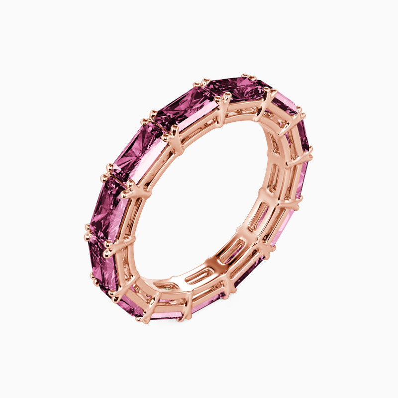 An exquisite symbol of your eternal love, this eternity wedding band is certain to capture her heart. Shimmering radiant-cut accents are set in shared prongs to complete this classic design. Sleek metal prongs further exemplify its luster. This eternity band is the best reminder of your timeless romance.