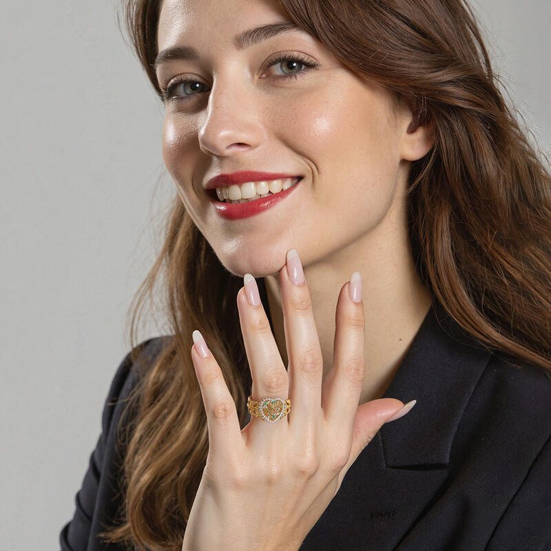 This ring is full of love for moms. The hollow design in the center adds to the sophistication of the ring. The vines embellished with stones surrounding the word "mom" show your willingness to protect her. The encircling heart-shaped ring frame accentuates this delicate design and enhances its brilliance. Motherhood: All Love begins and ends there.