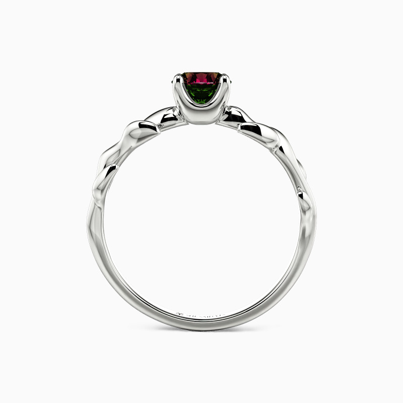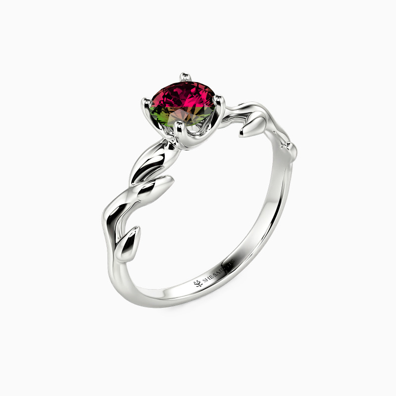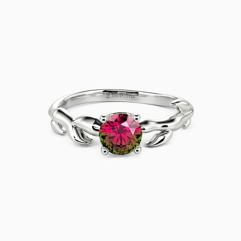 Nature-inspired for the chic bride-to-be. This solitaire engagement ring unveils a glistening round-cut stone studded in four prongs to shine at every angle. And leaf motifs on the polished shank further complement the center stone and overall look. So pop the question to her, and this ring will shine with your wonderful life together.