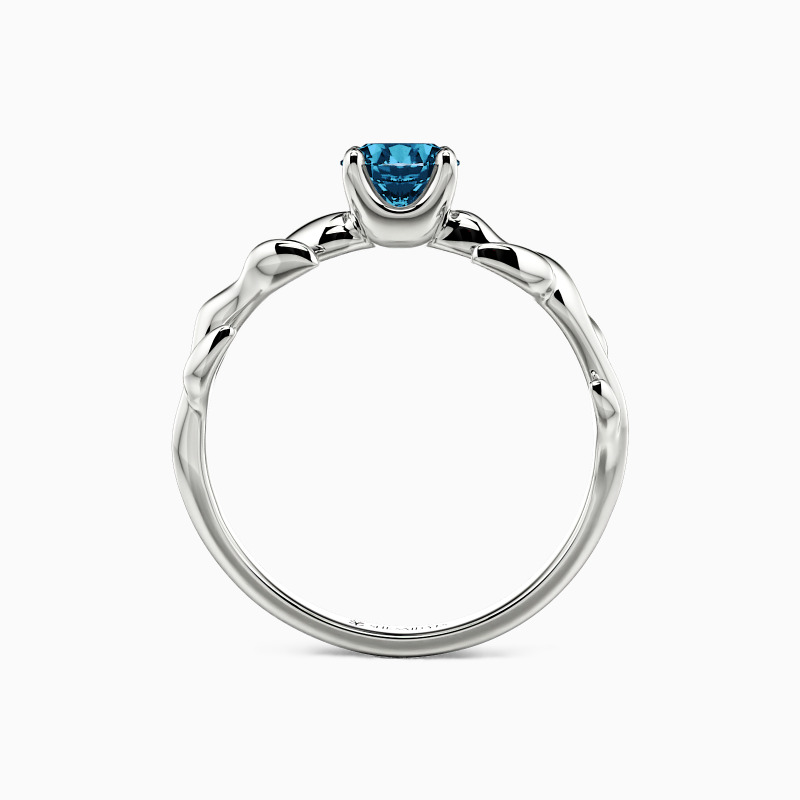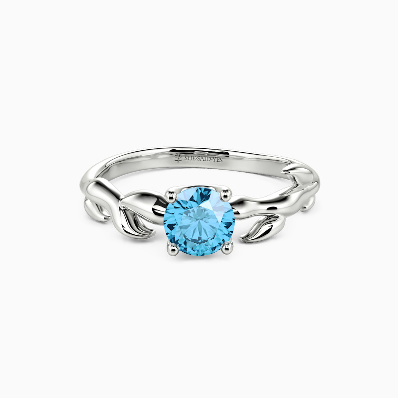Nature-inspired for the chic bride-to-be. This solitaire engagement ring unveils a glistening round-cut stone studded in four prongs to shine at every angle. And leaf motifs on the polished shank further complement the center stone and overall look. So pop the question to her, and this ring will shine with your wonderful life together.