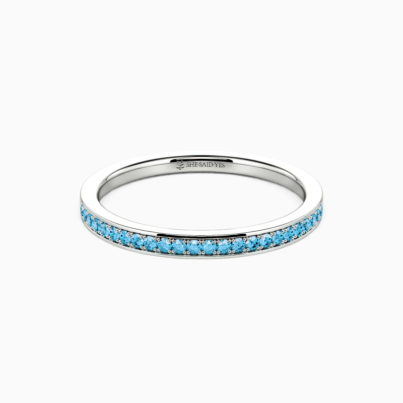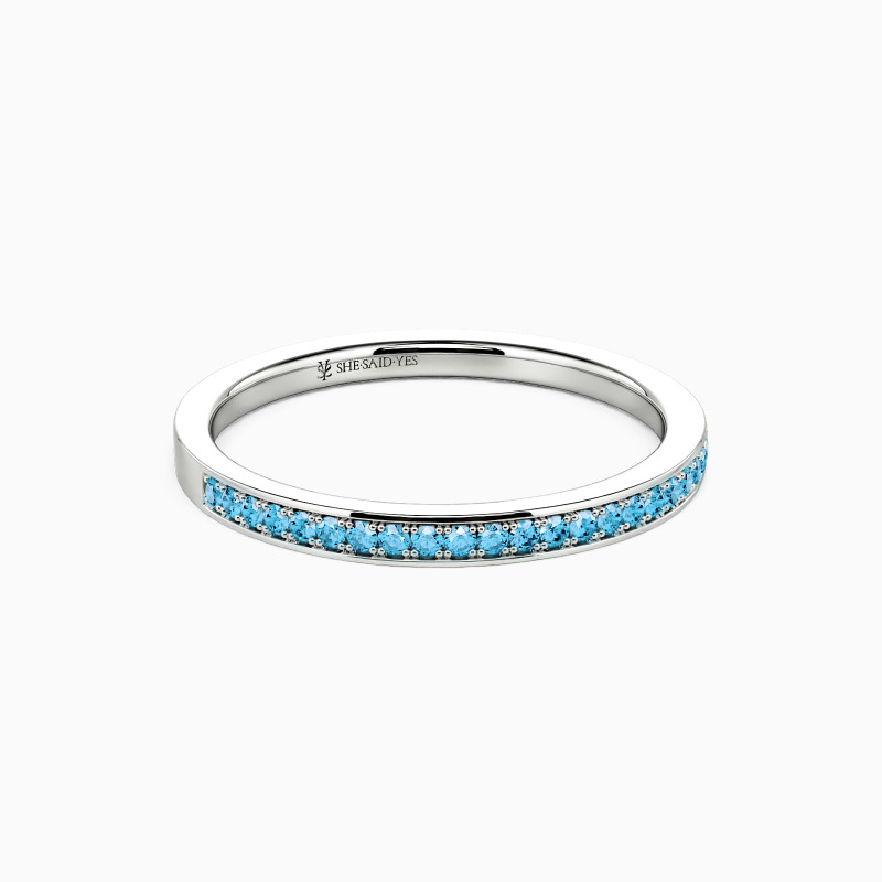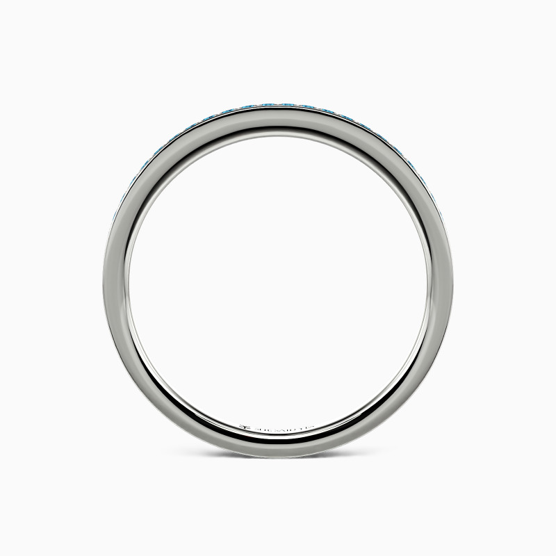 A series of twinkling round-cut stones in a pavé setting gracefully cover the shank with polished edges. This classic wedding band adds an elegant but stylish statement to your appearance. It also can be paired with an engagement to complete a shimmering bridal set.