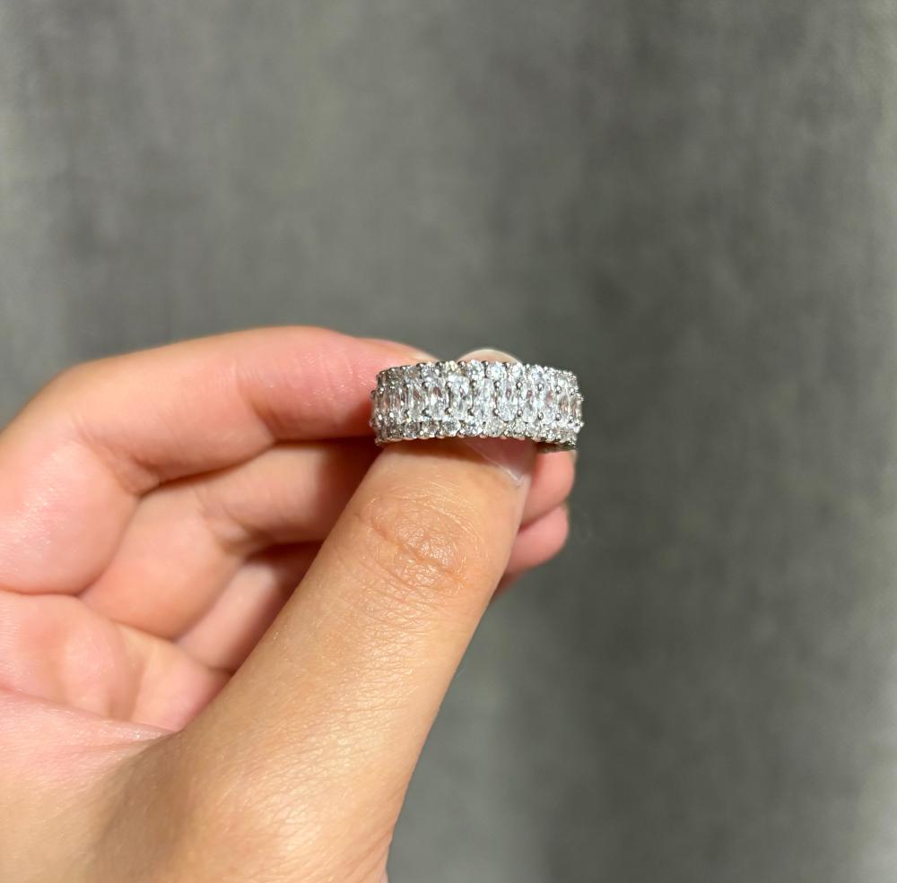 Commemorate the exciting moment with this eternity wedding band. It creates a beautiful cluster design by combining glittering oval-cut and round-cut accents. Three rows of handpicked stones exhibit superior sparkle to show your glamour. I'll always love you like it's the beginning, and I swear with this ring for my sincere heart.